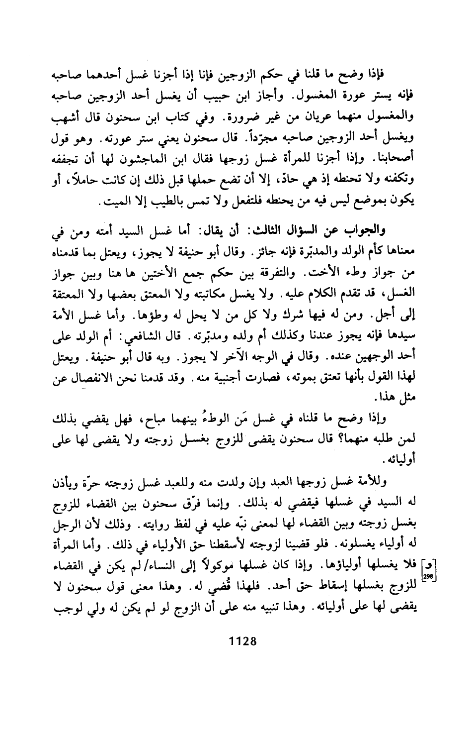 وللامة غسل زوجها العبد وإن ولدت منه وللعبد غسل زوجته حرّة ويأذن له السيد في غسلها فيقضي له بذلك. وإنما فرق سحنون بين القضاء للزوج بغسل زوجته وبين القضاء لها لمعنى نبه عليه في لفظ روايته. وذلك لأن الرجل له أولياء يغسلونه. فلو قضينا لزوجته لأسقطنا حق الأولياء في ذلك. وأما المرأة فلا يغسلها أولياؤها. وإذا كان غسلها موكولًا إلى النساء لم يكن في القضاء للزوج بغسلها إسقاط حق أحد. فلهذا قُضي له. وهذا معنى قول سحنون لا يقضى لها على أوليائه. وهذا تنبيه منه على أن الزوج لو لم يكن له ولي لوجب