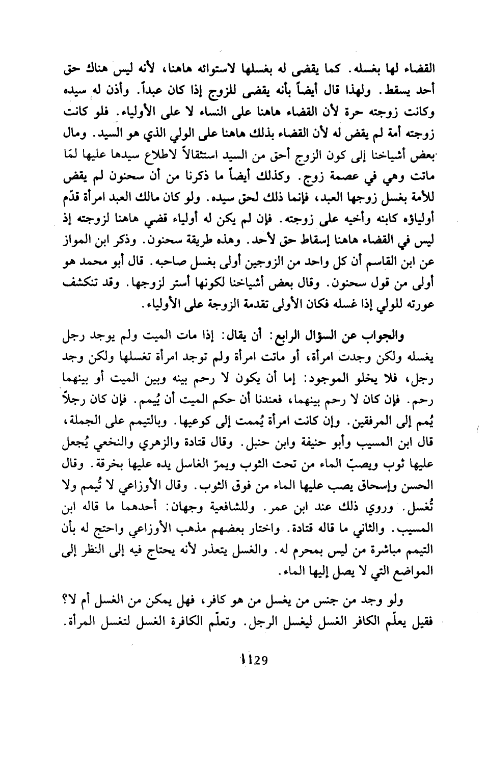 القضاء لها بغسله. كما يقضى له بغسلها لاستوائه ها هنا, لأنه ليس هناك حق أحد يسقط. ولهذا قال أيضًا بأنه يقضى للزوج إذا كان عبدًا. وأذن له سيده وكانت زوجته حرة لأن القضاء ها هنا على النساء لا على الأولياء. فلو كانت زوجته أمة لم يقض له لأن القضاء بذلك ها هنا على الولي الذي هو السيد. ومال بعض أشياخنا إلى كون الزوج أحق من السيد استثقالًا لاطلاع سيدها عليها لمّا ماتت وهي في عصمة زوج. وكذلك أيضًا ما ذكرنا من أن سحنون لم يقض للأمة بغسل زوجها العبد، فإنما ذلك لحق سيده. ولو كان مالك العبد امرأة قدّم أولياؤه كابنه وأخيه على زوجته. فإن لم يكن له أولياء قضي ها هنا لزوجته إذ ليس في القضاء ها هنا إسقاط حق لأحد. وهذه طريقة سحنون. وذكر ابن المواز عن ابن القاسم أن كل واحد من الزوجين أولى بغسل صاحبه. قال أبو محمَّد هو أولى من قول سحنون. وقال بعض أشياخنا لكونها أستر لزوجها. وقد تنكشف عورته للولي إذا غسله فكان الأولى تقدمة الزوجة على الأولياء.