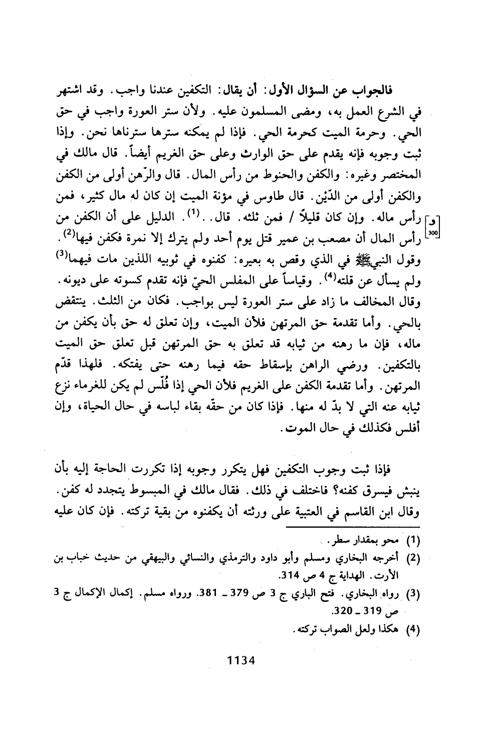 وقول النبي - صلى الله عليه وسلم - في الذي وقص به بعيره: كفنوه في ثوبيه اللذين مات فيهما (¬3) ولم يسأل عن قلته (¬4). وقياسًا على المفلس الحيّ فإنه تقدم كسوته على ديونه.
