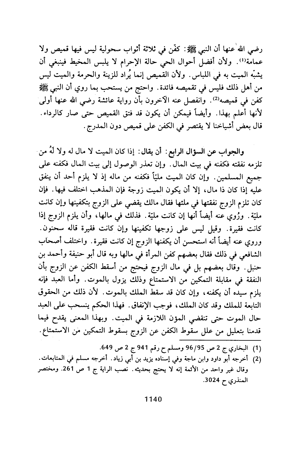 والجواب عن السؤال الرابع: أن يقال: إذا كان الميت لا مال له ولا لهُ من تلزمه نفقته فكفنه في بيت المال. وإن تعذر الوصول إلى بيت المال فكفنه على جميع المسلمين. وإن كان الميت مليًّا فكفنه من ماله إذ لا يلزم أحد أن ينفق عليه إذا كان ذا مال، إلا أن يكون الميت زوجة فإن المذهب اختلف فيها. فإن كان تلزم الزوج نفقتها في ملئها فقال مالك يقضي على الزوج بتكفينها وإن كانت ملية. ورُوي عنه أيضًا أنها إن كانت مليّة. فذلك في مالها، وأن يلزم الزوج إذا كانت فقيرة. وقيل ليس على زوجها تكفينها وإن كانت فقيرة قاله سحنون.