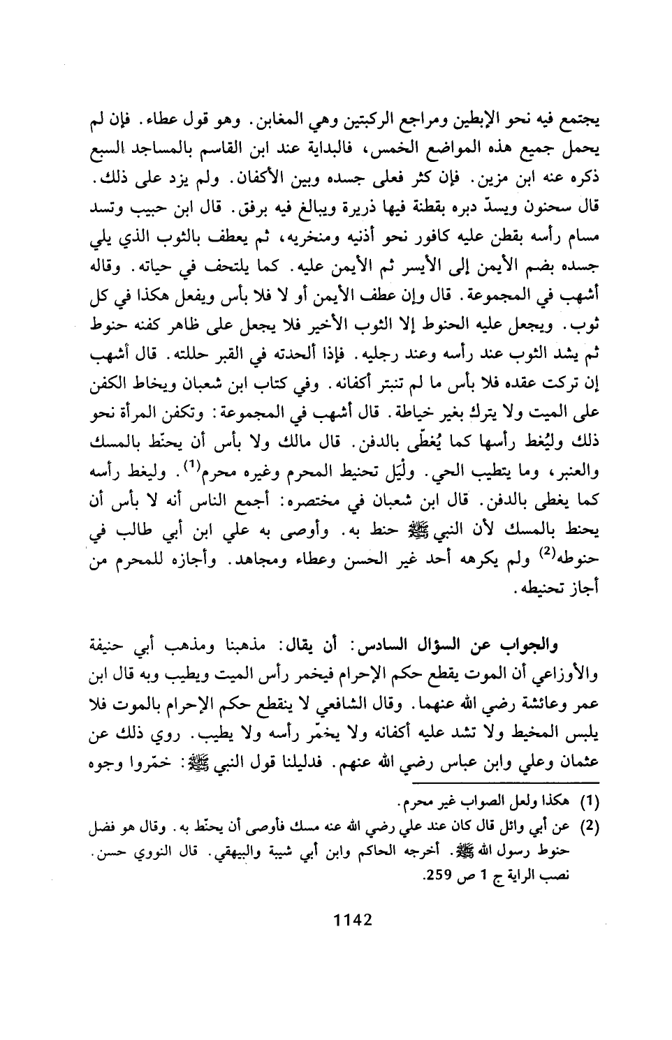 والجواب عن السؤال السادس: أن يقال: مذهبنا ومذهب أبي حنيفة والأوزاعي أن الموت يقطع حكم الإحرام فيخمر رأس الميت ويطيب وبه قال ابن عمر وعائشة رضي الله عنهما. وقال الشافعي لا ينقطع حكم الإحرام بالموت فلا يلبس المخيط ولا تشد عليه أكفانه ولا يخمّر رأسه ولا يطيب. روي ذلك عن عثمان وعلي وابن عباس رضي الله عنهم. فدليلنا قول النبي - صلى الله عليه وسلم -: خمّروا وجوه