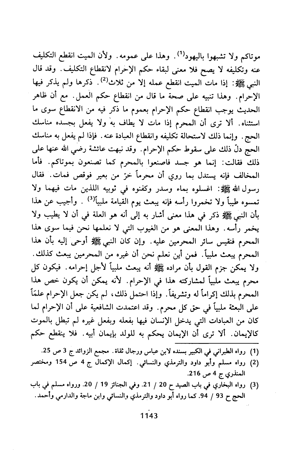 ولا يمكن جزم القول بأن مراده - صلى الله عليه وسلم - أنه يبعث ملبيًا لأجل إحرامه. فيكون كل محرم يبعث ملبيًا لمشاركته هذا في الإحرام. لأنه يمكن أن يكون خص هذا المحرم بذلك إكرامًا له وتشريفًا. وإذا احتمل ذلك، لم يكن جعل الإحرام علمًا على البعثة ملبيًا في حق كل محرم. وقد اعتمدت الشافعية على أن الإحرام لما كان من العبادات التي يدخل الإنسان فيها بفعله وبفعل غيره لم تبطل بالموت كالإيمان. ألا ترى أن الإيمان يحكم به للولد بإيمان أبيه. فلا ينقطع حكم