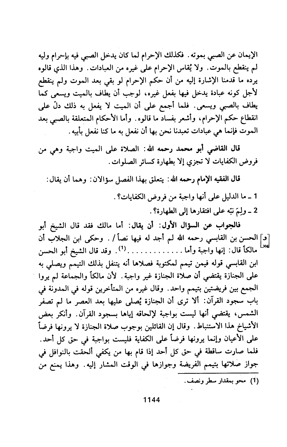 فالجواب عن السؤال الأول: أن يقال: أما مالك فقد قال الشيخ أبو الحسن بن القابسي رحمه الله لم أجد له فيها نصًا. وحكى ابن الجلاب أن مالكًا قال: انها واحمة وأما ................. (¬1). وقد قال الشيخ أبو الحسن ابن القابسي قوله فيمن تيمم لمكتوبة فصلاها أنه يتنفل بذلك التيمم ويصلي به على الجنازة يقتضي أن صلاة الجنازة غير واجبة. لأن مالكًا والجماعة لم يروا الجمع بين فريضتين بتيمم واحد. وقال غيره من المتأخرين قوله في المدونة في باب سجود القرآن: ألا ترى أن الجنازة يُصلى عليها بعد العصر ما لم تصفر الشمس، يقتضي أنها ليست بواجبة لإلحاقه إياها بسجود القرآن. وأنكر بعض الأشياخ هذا الاستنباط. وتال إن القائلين بوجوب صلاة الجنازة لا يرونها فرضًا على الأعيان وإنما يرونها فرضًا على الكفاية فليست بواجبة في حق كل أحد.