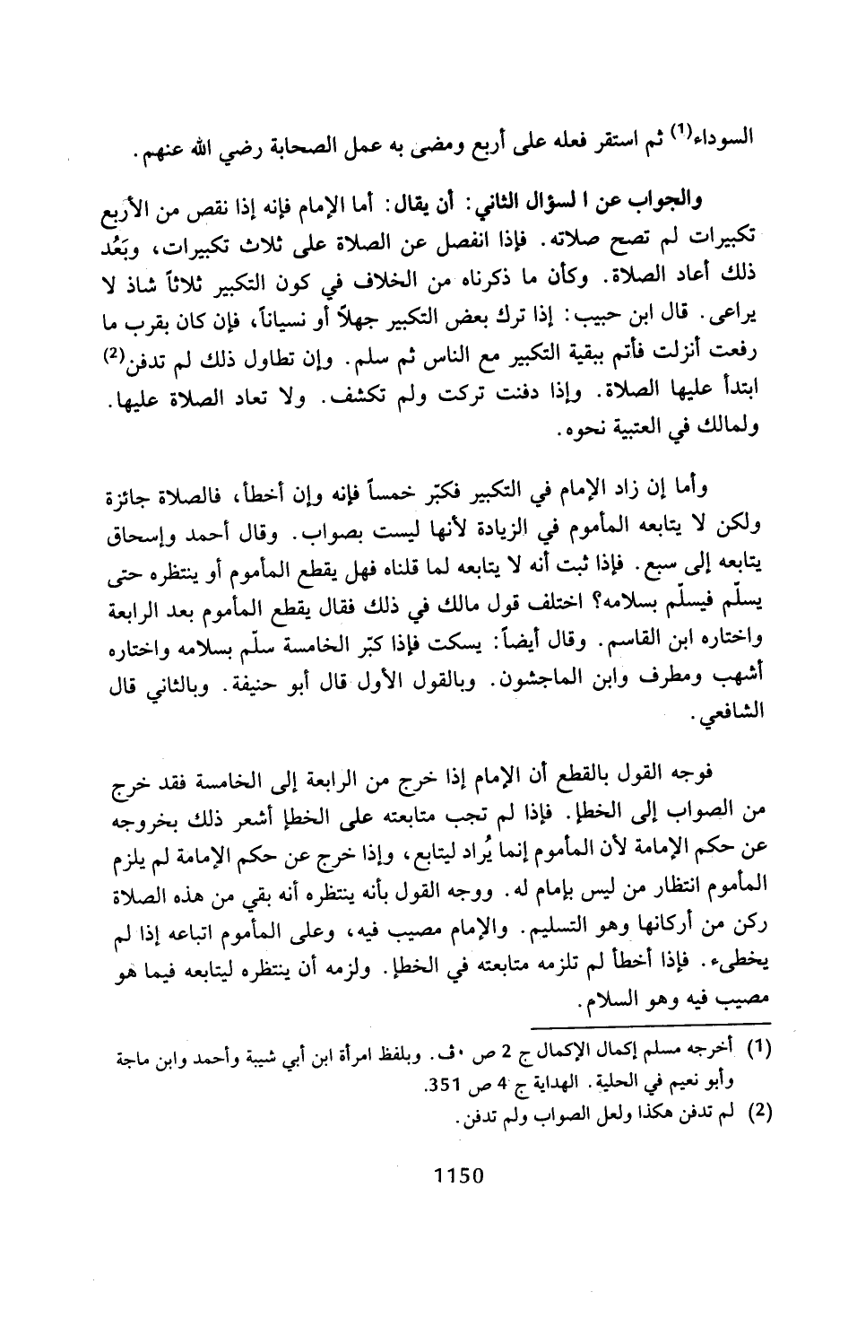 والجواب عن السؤال الثاني: أن يقال: أما الإِمام فإنه إذا نقص من الأربع تكبيرات لم تصح صلاته. فإذا انفصل عن الصلاة على ثلاث تكبيرات، وبَعُد ذلك أعاد الصلاة. وكان ما ذكرناه من الخلاف في كون التكبير ثلاثًا شاذ لا يراعى. قال ابن حبيب: إذا ترك بعض التكبير جهلًا أو نسيانًا، فإن كان بقرب ما رفعت أنزلت فأتم ببقية التكبير مع الناس ثم سلم. وإن تطاول ذلك لم تدفن (¬2) ابتدأ عليها الصلاة. وإذا دفنت تركت ولم تكشف. ولا تعاد الصلاة عليها. ولمالك في العتبية نحوه.