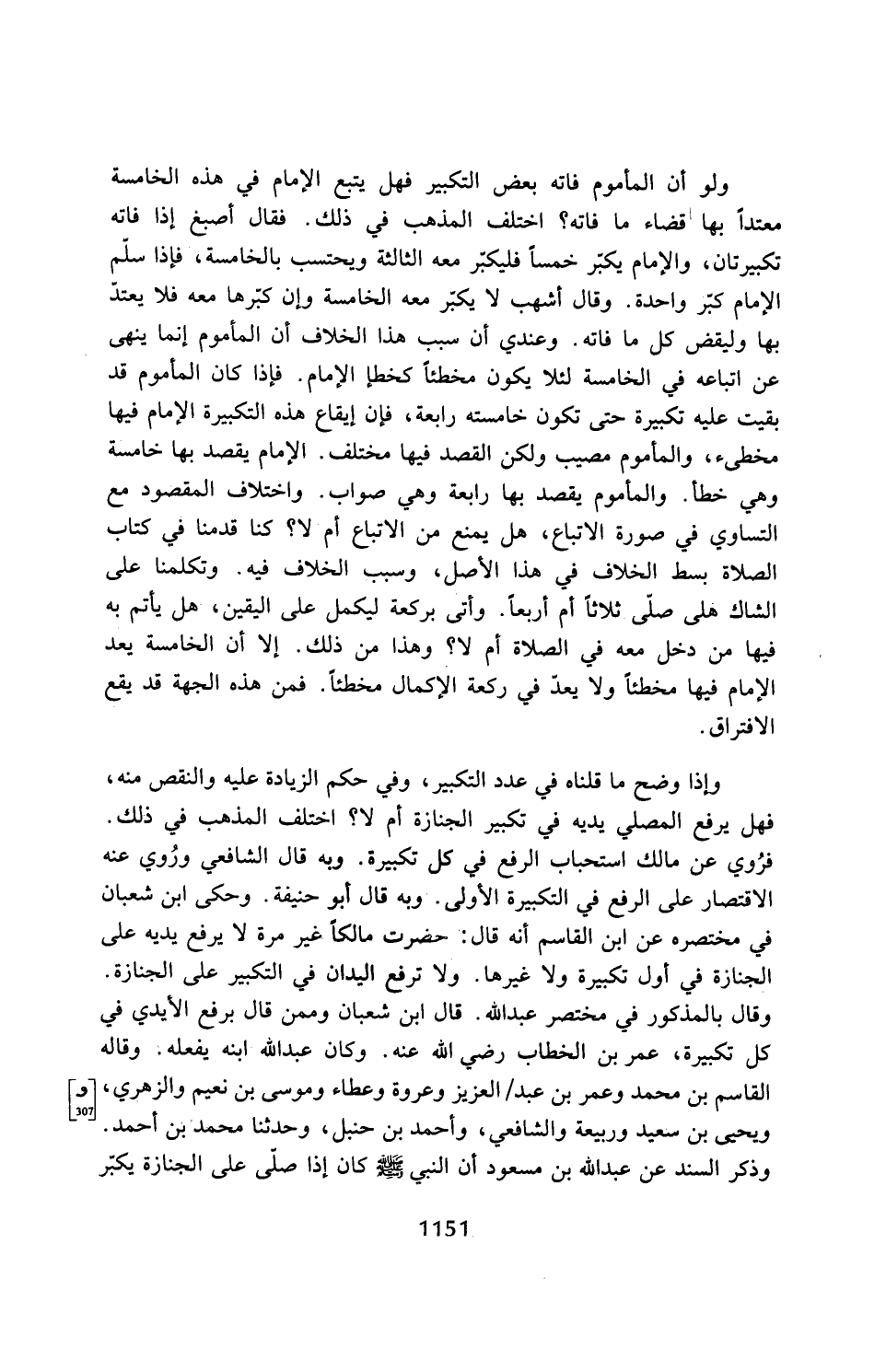 فإذا كان المأموم قد بقيت عليه تكبيرة حتى تكون خامسته رابعة، فإن إيقاع هذه التكبيرة الإِمام فيها مخطئ، والمأموم مصيب ولكن القصد فيها مختلف. الإِمام يقصد بها خامسة وهي خطأ. والمأموم يقصد بها رابعة وهي صواب. واختلاف المقصود مع التساوي في سورة الاتباع، هل يمنع من الاتباع أم لا؟ كنا قدمنا في كتاب الصلاة بسط الخلاف في هذا الأصل، وسبب الخلاف فيه. وتكلمنا على الشاك هلى صلى ثلاثًا أم أربعًا. وأتى بركعة ليكمل على اليقين، هل يأتم به فيها من دخل معه في الصلاة أم لا؛ وهذا من ذلك. إلا أن الخامسة يعد الإِمام فيها مخطئًا ولا يعد في ركعة الإكمال مخطئًا. فمن هذه الجهة قد يقع الافتراق.