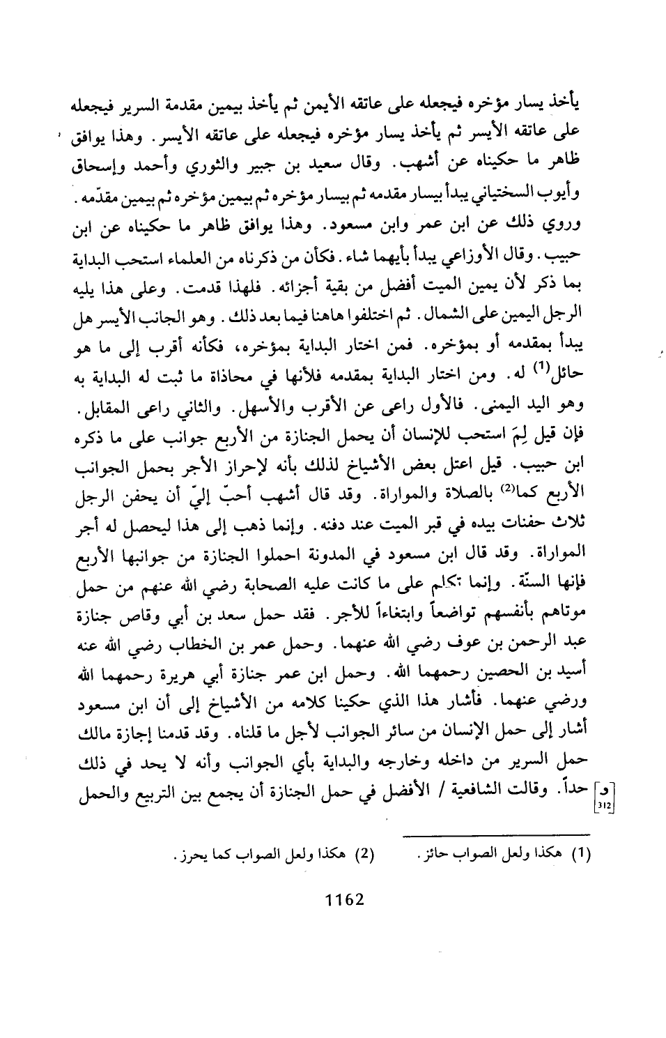 فإن قيل لِمَ استحب للإنسان أن يحمل الجنازة من الأربع جوانب على ما ذكره ابن حبيب. قيل اعتل بعض الأشياخ لذلك بأنه لإحراز الأجر يحمل الجوانب الأربع كما (¬2) بالصلاة والمواراة. وقد قال أشهب أحبّ إليّ أن يحفن الرجل ثلاث حفنات بيده في قبر الميت عند دفنه. وإنما ذهب إلى هذا ليحصل له أجر المواراة. وقد قال ابن مسعود في المدونة احملوا الجنازة من جوانبها الأربع فإنها السنّة. وإنما تكلم على ما كانت عليه الصحابة رضي الله عنهم من حمل موتاهم بأنفسهم تواضعًا وابتغاءًا للأجر. فقد حمل سعد بن أبي وقاص جنازة عبد الرحمن بن عوف رضي الله عنهما. وحمل عمر بن الخطاب رضي الله عنه أسيد بن الحصين رحمهما الله. وحمل ابن عمر جنازة أبي هريرة رحمهما الله ورضي عنهما. فأشار هذا الذي حكينا كلامه من الأشياخ إلى أن ابن مسعود أشار إلى حمل الإنسان من سائر الجوانب لأجل ما قلناه. وقد قدمنا إجازة مالك حمل السرير من داخله وخارجه والبداية بأي الجوانب وأنه لا يحد في ذلك حدًا. وقالت الشافعية الأفضل في حمل الجنازة أن يجمع بين التربيع والحمل