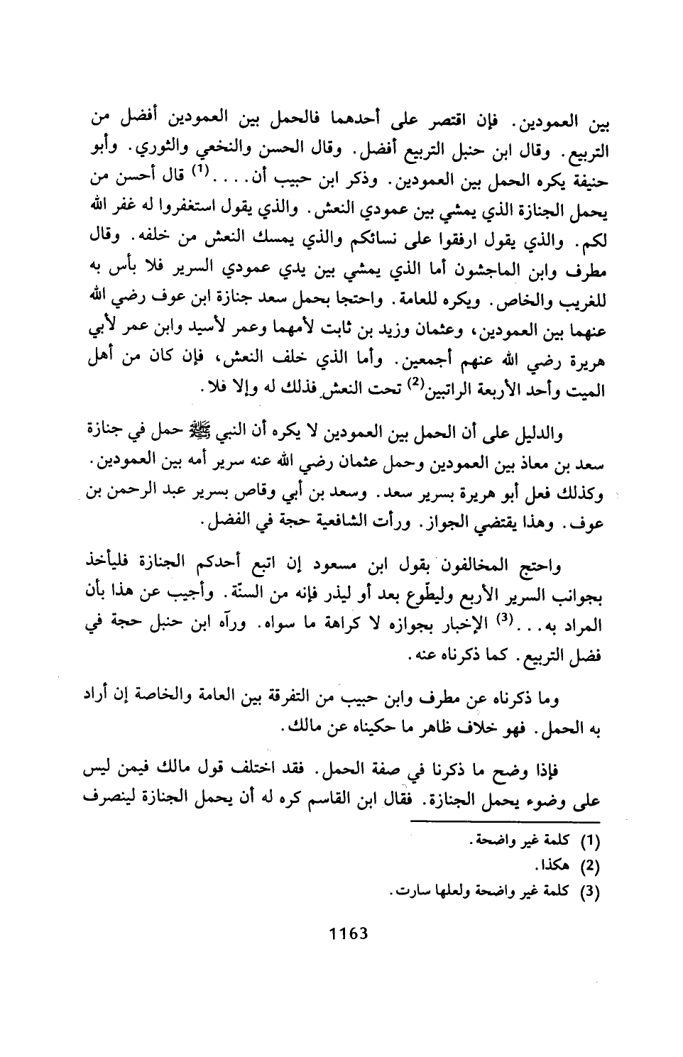 بين العمودين. فإن اقتصر على أحدهما فالحمل بين العمودين أفضل من التربيع. وقال ابن حنبل التربيع أفضل. وقال الحسن والنخعي والثوري. وأبو حنيفة يكره العمل بين العمودين. وذكر ابن حبيب أن .... (¬1) قال أحسن من يحمل الجنازة الذي يمشي بين عمودي النعش. والذي يقول استغفروا له غفر الله لكم. والذي يقول ارفقوا على نسائكم والذي يمسك النعش من خلفه. وقال مطرت وابن الماجشون أما الذي يمشي بين يدي عمودي السرير فلا بأس به للغريب والخاص. ويكره للعامة. واحتجا يحمل سعد جنازة ابن عوف رضي الله عنهما بين العمودين، وعثمان وزيد بن ثابت لأمهما وعمر لأسيد وابن عمر لأبي هريرة رضي الله عنهم أجمعين. وأما الذي خلف النعش، فإن كان من أهل الميت واحد الأربعة الراتبين (¬2) تحت النعش فذلك له وإلا فلا.