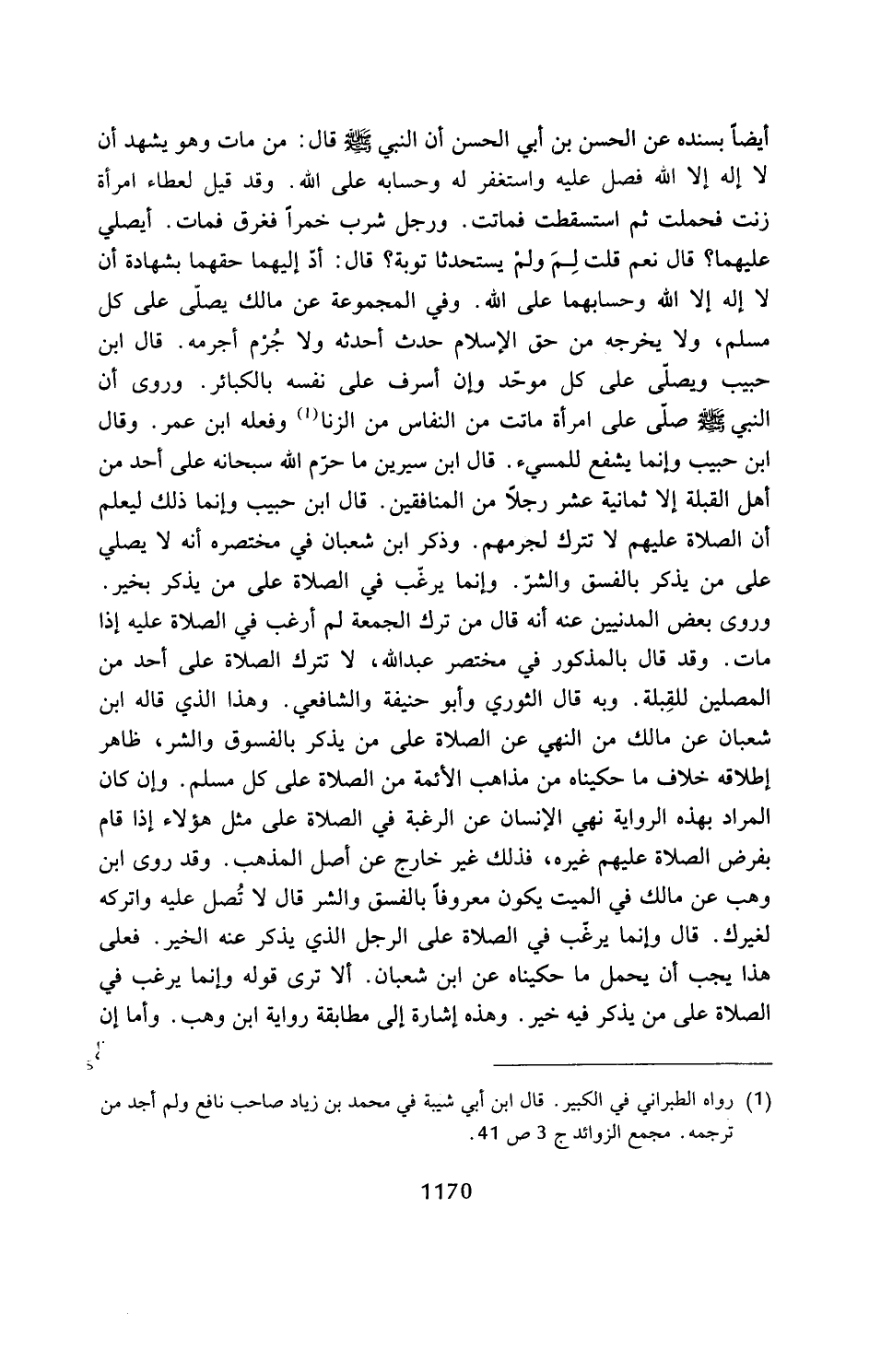 أيضًا بسنده عن الحسن بن أبي الحسن أن النبي - صلى الله عليه وسلم - قال: من مات وهو يشهد أن لا إله إلا الله فصل عليه واستغفر له وحسابه على الله. وقد قيل لعطاء امرأة زنت فحملت ثم استسقطت فماتت. ورجل شرب خمرًا فغرق فمات. أيصلي عليهما؟ قال نعم قلت لِمَ ولمْ يستحدثا توبة؟ قال: أذ إليهما حقهما بشهادة أن لا إله إلا الله وحسابهما على الله. وفي المجموعة عن مالك يصلّى على كل مسلم، ولا يخرجه من حق الإِسلام حدث أحدثه ولا جُرْم أجرمه. قال ابن حبيب ويصلّى على كل موحّد وإن أسرف على نفسه بالكبائر. وروى أن النبي - صلى الله عليه وسلم - صلى على امرأة ماتت من النفاس من الزنا (¬1) وفعله ابن عمر. وقال ابن حبيب وإنما يشفع للمسيء. قال ابن سيرين ما حزم الله سبحانه على أحد من أهل القبلة إلا ثمانية عشر رجلًا من المنافقين. قال ابن حبيب وإنما ذلك ليعلم أن الصلاة عليهم لا تترك لجرمهم. وذكر ابن شعبان في مختصره أنه لا يصلي على من يذكر بالفسق والشرّ. وإنما يرغب في الصلاة على من يذكر بخير.