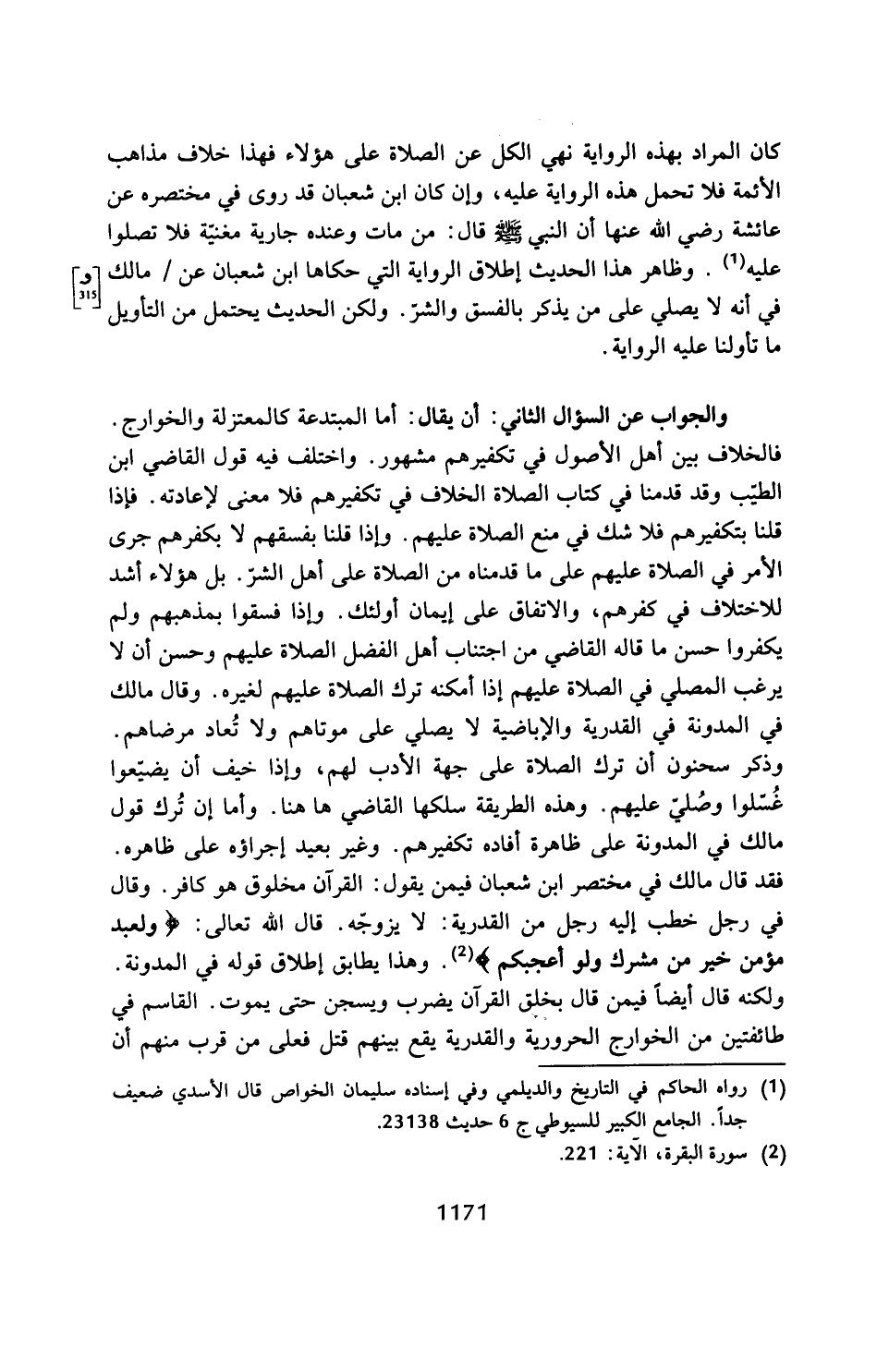 والجواب عن السؤال الثاني: أن يقال: أما المبتدعة كالمعتزلة والخوارج. فالخلاف بين أهل الأصول في تكفيرهم مشهور. واختلف فيه قول القاضي ابن الطيب وقد قدمنا في كتاب الصلاة الخلاف في تكفيرهم فلا معنى لإعادته. فإذا قلنا بتكفيرهم فلا شك في منع الصلاة عليهم. وإذا قلنا بفسقهم لا بكفرهم جرى الأمر في الصلاة عليهم على ما قدمناه من الصلاة على أهل الشرِّ. بل هؤلاء أشد للاختلاف في كفرهم، والاتفاق على إيمان أولىك. وإذا فسقوا بمذهبهم ولم يكفروا حسن ما قاله القاضي من اجتناب أهل الفضل الصلاة عليهم وحسن أن لا يرغب المصلي في الصلاة عليهم إذا أمكنه ترك الصلاة عليهم لغيره. وقال مالك في المدونة في القدرية والإباضية لا يصلي على موتاهم ولا تُعاد مرضاهم.