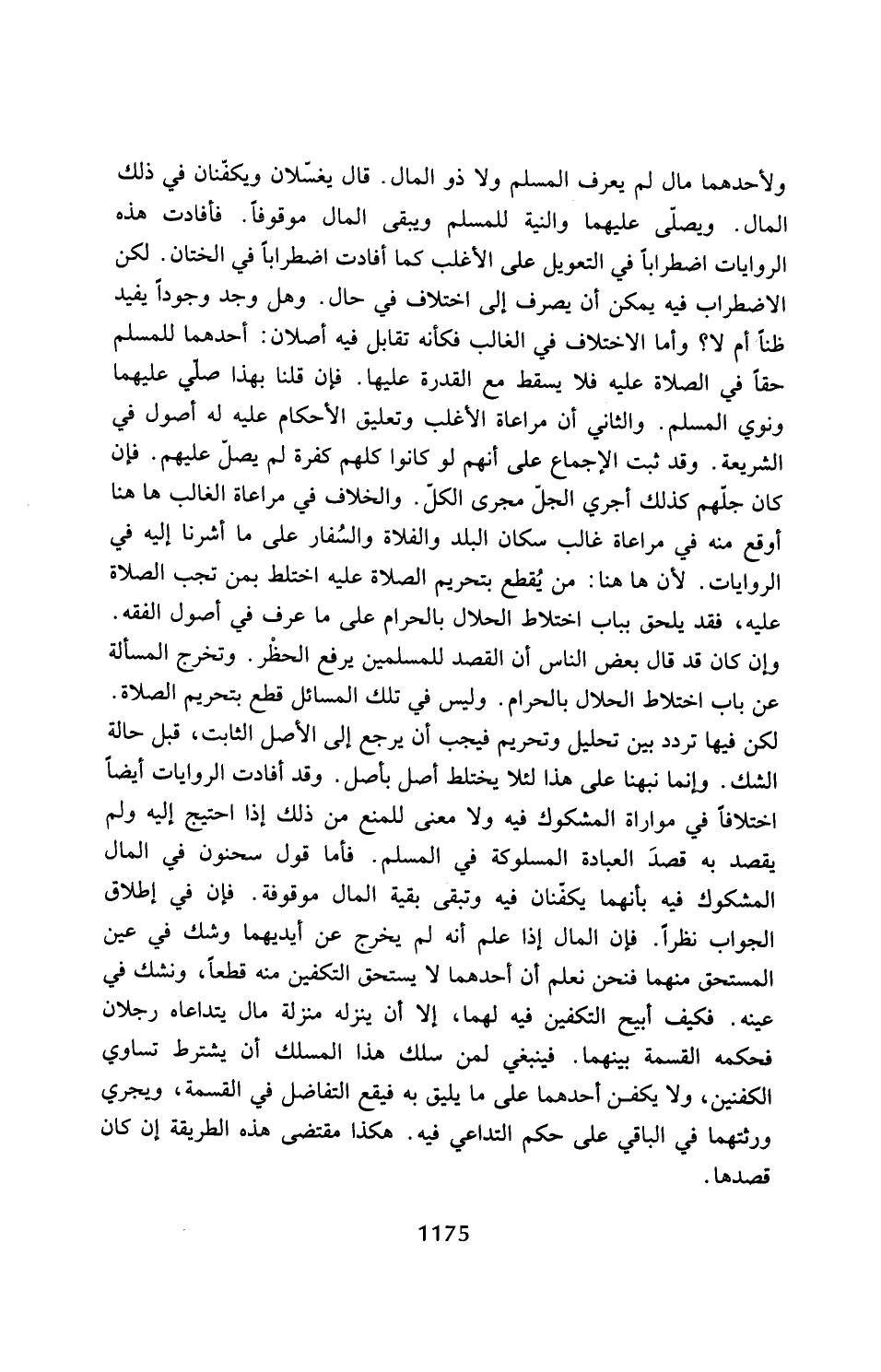 لكن فيها تردد بين تحليل وتحريم فيجب أن يرجع إلى الأصل الثابت، قبل حالة الشك. وإنما نبهنا على هذا لئلا يختلط أصل بأصل. وقد أفادت الروايات أيضًا اختلافًا في مواراة المشكوك فيه ولا معنى للمنع من ذلك إذا احتيج إليه ولم يقصد به قصدَ العبادة المسلوكة في المسلم. فأما قول سحنون في المال المشكوك فيه بانهما يكفّنان فيه وتبقى بقية المال موقوفة. فإن في إطلاق الجواب نظراً. فإن المال إذا علم أنه لم يخرج عن أيديهما وشك في عين المستحق منهما فنحن نعلم أن أحدهما لا يستحق التكفين منه قطعًا، ونشك في عينه. فكيف أبيح التكفين فيه لهما، إلا أن ينزله منزلة مال يتداعاه رجلان فحكمه القسمة بينهما. فينبغي لمن سلك هذا المسلك أن يشترط تساوي الكفنين، ولا يكفن أحدهما على ما يليق به فيقع التفاضل في القسمة، ويجري ورثتهما في الباقي على حكم التداعي فيه. هكذا مقتضى هذه الطريقة إن كان قصدها.