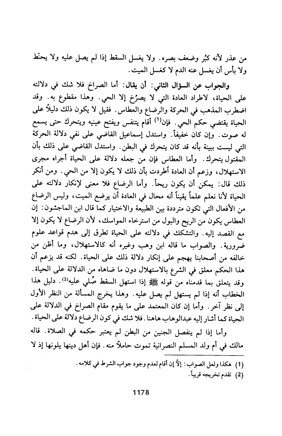 والجواب عن السؤال الثاني: أن يقال: أما الصراخ فلا شك في دلالته على الحياة، لاطراد العادة التي لا يصرُخ إلا الحي. وهذا مقطوع به. وقد اضطرب المذهب في الحركة والرضاع والعطاس. فقيل لا يكون ذلك دليلًا على الحياة يقتضي حكم الحي. فإن (¬1) أقام يتنفس ويفتح عينيه ويتحرك حتى يسمع له صوت. وإن كان خفيفًا. واستدل إسماعيل القاضي على نفي دلالة الحركة التي ليست ببينة بأنه قد كان يتحرك في البطن. واستدل القاضي على ذلك بأن المقتول يتحرك. وأما العطاس فإن من جعله دلالة على الحياة أجراه مجرى الاستهلال، وزعم أن العادة أطردت بأن ذلك لا يكون إلا من الحي. ومن أنكر ذلك قال: يمكن أن يكون ريحًا. وأما الرضاع فلا معنى لإنكار دلالته على الحياة لأنا نعلم علمًا يقينًا أنه محال في العادة أن يرضع الميت، وليس الرضاع من الأفعال التي تكون مترددة بين الطبيعة والاختيار كما قال ابن الماجشون: إن العطاس يكون من الريح والبول من استرخاء المواسك، لأن الرضاع لا يكون إلا مع القصد إليه. والتشكك في دلالته على الحياة تطرق إلى هدم قواعد علوم ضرورية. والصواب ما قاله ابن وهب وغيره أنه كالاستهلال، وما أظن من خالفه من أصحابنا يهجم على إنكار دلالة ذلك على الحياة. لكنه قد يزعم أن هذا الحكم معلق في الشرع بالاستهلال دون ما ضاهاه من الدلالة على الحياة.