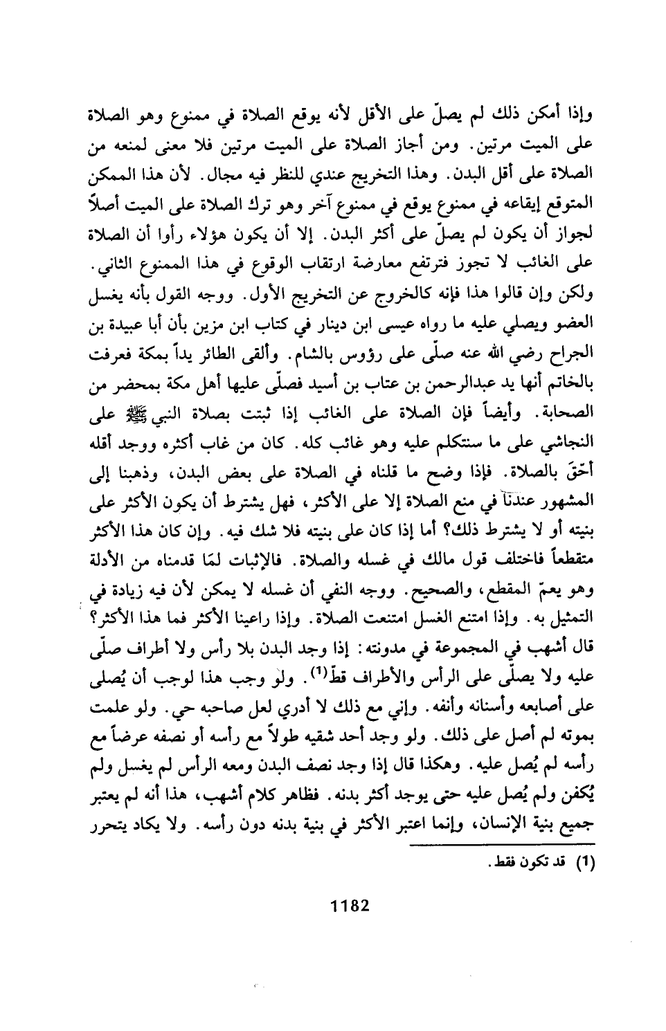 وإذا أمكن ذلك لم يصل على الأقل لأنه يوقع الصلاة في ممنوع وهو الصلاة على الميت مرتين. ومن أجاز الصلاة على الميت مرتين فلا معنى لمنعه من الصلاة على أقل البدن. وهذا التخريج عندي للنظر فيه مجال. لأن هذا الممكن المتوقع إيقاعه في ممنوع يوقع في ممنوع آخر وهو ترك الصلاة على الميت أصلًا لجواز أن يكون لم يصل على الأكثر البدن. إلا أن يكون هؤلاء رأوا أن الصلاة على الغائب لا تجوز فترتفع معارضة ارتقاب الوقوع في هذا الممنوع الثاني.