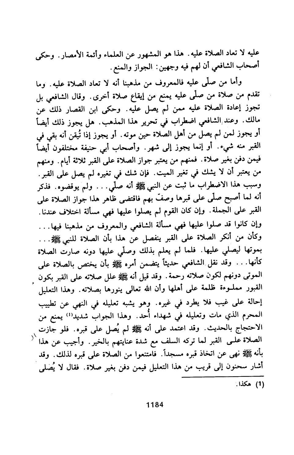 عليه لا تعاد الصلاة عليه. هذا هو المشهور عن العلماء وأئمة الأمصار. وحكى أصحاب الشافعي أن لهم فيه وجهين: الجواز والمنع.
