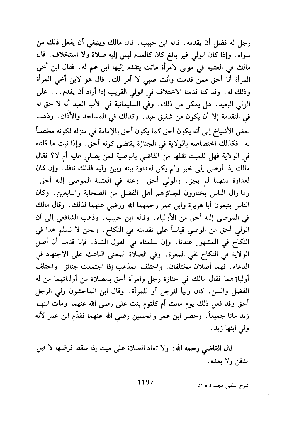 رجل له فضل أن يقدمه. قاله ابن حبيب. قال مالك وينبغي أن يفعل ذلك من سواه. وإذا كان الولي غير بالغ كان كالعدم ليس إليه صلاة ولا استخلاف. قال مالك في العتبية في مولى لامرأة ماتت يتقدم إليها ابن عم له. فقال ابن أخي المرأة أنا أحق ممن قدمت وأنت صبي لا أمر لك. قال هو لابن أخي المرأة وذلك له. وقد كنا قدمنا الاختلاف في الولي القريب إذا أراد أن يقدم ... على الولي البعيد، هل يمكن من ذلك. وفي السليمانية في الأب العبد أنه لا حق له في التقدمة إلا أن يكون من شقيق عبد. وكذلك في المساجد والأذان. وذهب بعض الأشياخ إلى أنه يكون أحق كما يكون أحق بالإمامة في منزله لكونه مختصاً به. فكذلك اختصاصه بالولاية في الجنازة يقتضي كونه أحق. وإذا ثبت ما قلناه في الولاية فهل للميت نقلها من القاضي بالوصية لمن يصلي عليه أم لا؟ فقال مالك إذا أوصى إلى خير ولم يكن لعداوة بينه وبين وليه فذلك نافذ. وإن كان لعداوة بينهما لم يجز. والولي أحق. وعنه في العتبية الموصى إليه أحق.