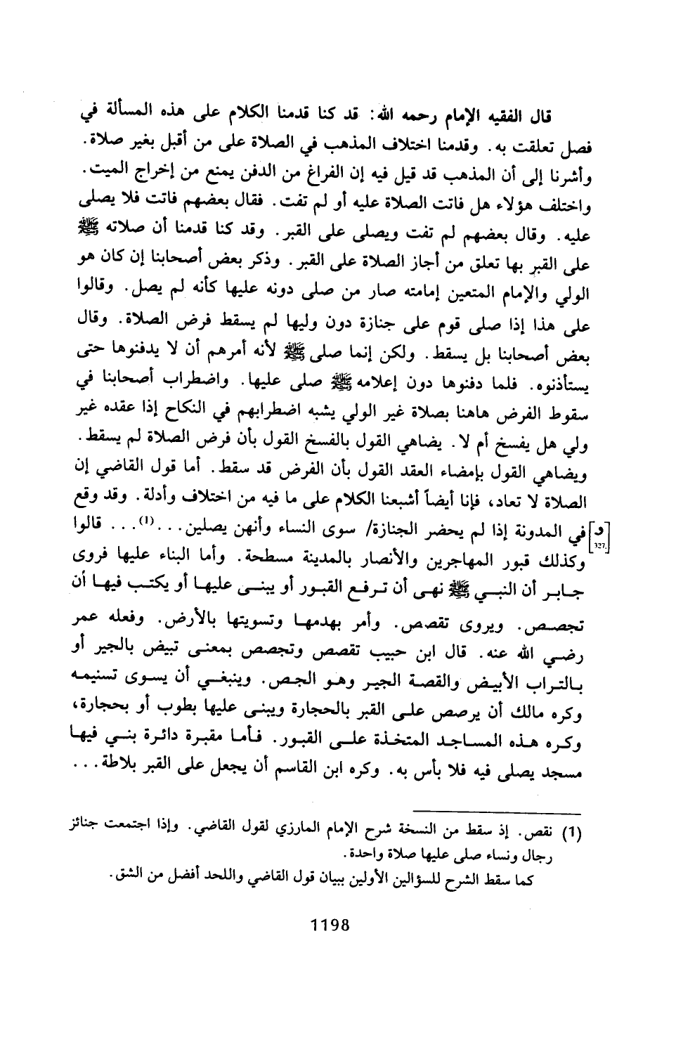 ويضاهي القول بإمضاء العقد القول بأن الفرض قد سقط. أما قول القاضي إن الصلاة لا تعاد، فإنا أيضًا أشبعنا الكلام على ما فيه من اختلاف وأدلة. وقد وقع في المدونة إذا لم يحضر الجنازة سوى النساء وأنهن يصلين ... (¬1) ... قالوا وكذلك قبور المهاجرين والأنصار بالمدينة مسطحة. وأما البناء عليها فروى جابر أن النبي - صلى الله عليه وسلم - نهى أن ترفع القبور أو يبنى عليها أو يكتب فيها أن تجصص. ويروى تقص. وأمر بهدمها وتسويتها بالأرض. وفعله عمر رضي الله عنه. قال ابن حبيب تقصص وتجصص بمعنى تبيض بالجير أو بالتراب الأبيض والقصة الجير وهو الجنة. وينبغي أن يسوى تسنيمه وكره مالك أن يرصص على القبر بالحجارة ويبنى عليها بطوب أو بحجارة، وكره هذه المساجد المتخذة على القبور. فأما مقبرة دائرة بني فيها مسجد يصلى فيه فلا بأس به. وكره ابن القاسم أن يجعل على القبر بلاطة ...