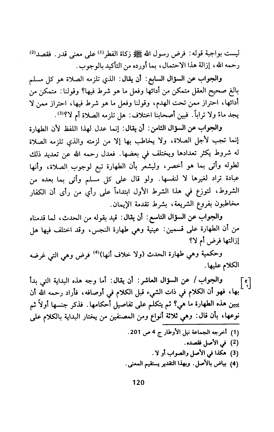 والجواب عن السؤال الثامن: أن يقال: إنما عدل لهذا اللفظ لأن الطهارة إنما تجب لأجل الصلاة، ولا يخاطب بها إلا من لزمته والذي تلزمه الصلاة له شروط يكثر تعدادها ويختلف في بعضها. فعدل رحمه الله عن تعديد ذلك لطوله وأتى بما هو أخصر، وليشعر بان الطهارة تبع لوجوب الصلاة، وأنها عبادة تراد لغيرها لا لنفسها. ولو قال على كل مسلم وأتى بما بعده من الشروط، لتوزع في هذا الشرط الأول ابتداءًا على رأي من رأى أن الكفار مخاطبون بفروع الشريعة، بشرط تقدمة الإيمان.