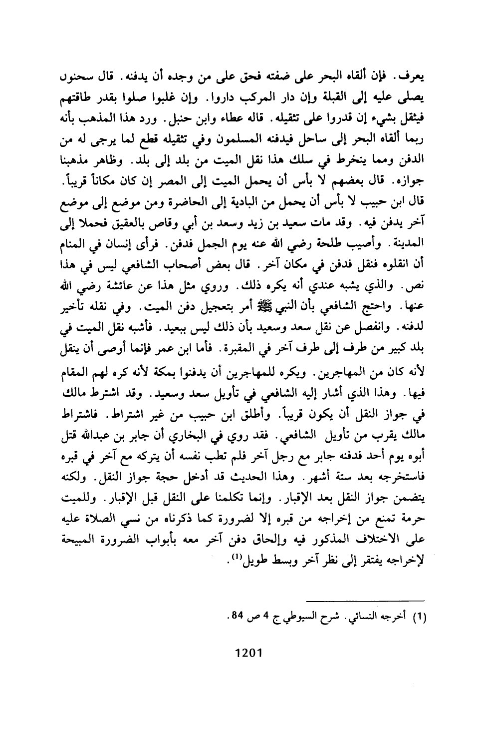 قال ابن حبيب لا بأس أن يحمل من البادية إلى الحاضرة ومن موضع إلى موضع آخر يدفن فيه. وقد مات سعيد بن زيد وسعد بن أبي وقاص بالعقيق فحملا إلى المدينة. وأصيب طلبة رضي الله عنه يوم الجمل فدفن. فرأى إنسان في المنام أن انقلوه فنقل فدفن في مكان آخر. قال بعض أصحاب الشافعي ليس في هذا نص. والذي يشبه عندي أنه يكره ذلك. وروي مثل هذا عن عائشة رضي الله عنها. واحتج الشافعي بأن النبي ي أمر بتعجيل دفن الميت. وفي نقله تأخير لدفنه. وانفصل عن نقل سعد وسعيد بأن ذلك ليس ببعيد. فأشبه نقل الميت في بلد كبير من طرف إلى طرف آخر في المقبرة. فأما ابن عمر فإنما أوصى أن ينقل لأنه كان من المهاجرين. ويكره للمهاجرين أن يدفنوا بمكة لأنه كره لهم المقام فيها. وهذا الذي أشار إليه الشافعي في تأويل سعد وسعيد. وقد اشترط مالك في جواز النقل أن يكون قريبًا. وأطلق ابن حبيب من غير اشتراط. فاشتراط مالك يقرب من تأويل الشافعي. فقد روي في البخاري أن جابر بن عبد الله قتل أبوه يوم أحد فدفنه جابر مع رجل آخر فلم تطب نفسه أن يتركه مع آخر في قبره فاستخرجه بعد ستة أشهر. وهذا الحديث قد أدخل حجة جواز النقل. ولكنه يتضمن جواز النقل بعد الإقبار. وإنما تكلمنا على النقل قبل الإقبار. وللميت حرمة تمنع من إخراجه من قبره إلا لضرورة كما ذكرناه من نسي الصلاة عليه على الاختلاف المذكور فيه وإلحاق دفن آخر معه بأبواب الضرورة المبيحة لإخراجه يفتقر إلى نظر آخر وبسط طويل (¬1).
