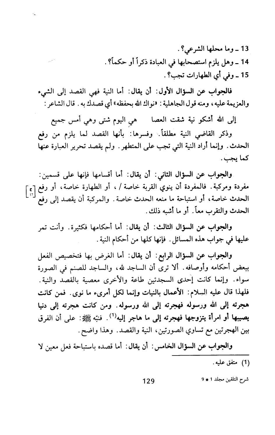 والجواب عن السؤال الثالث: أن يقال: أما أحكامها فكثيرة. وأنت تمر عليها في جواب هذه المسائل. فإنها كلها من أحكام النية.