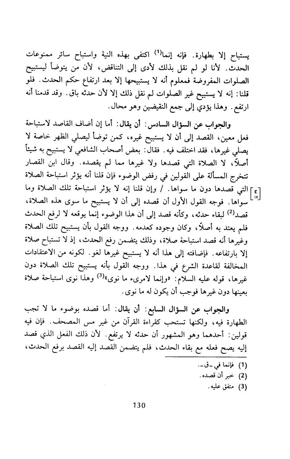 والجواب عن السؤال السادس: أن يقال: أما إن أضاف المقاصد لاستباحة فعل معين، القصد إلى أن لا يستبيح غيره، كمن توضأ ليصلي الظهر خاصة لا يصلي غيرها، فقد اختلف فيه. فقال: بعض أصحاب الشافعي لا يستبيح به شيئًا أصلًا، لا الصلاة التي قصدها ولا غيرها مما لم يقصده. وقال ابن القصار تتخرج المسألة على القولين في رفض الوضوء فإن قلنا أنه يؤثر استباحة الصلاة التي قصدها دون ما سواها. وإن قلنا إنه لا يؤثر استباحة تلك الصلاة وما سواها. فوجه القول الأول أن قصده إلى أن لا يستبيح ما سوى هذه الصلاة، قصد (¬2) لبقاء حدثه، وكأنه قصد إلى أن هذا الوضوء إنما يوقعه لا لرفع الحدث فلم يعتد به أصلًا، وكان وجوده كعدمه. ووجه القول بأن يستبيح تلك الصلاة وغيرها أنه قصد استباحة صلاة، وذلك يتضمن رفع الحدث، إذ لا تستباح صلاة إلا بارتفاعه. فإضافته إلى هذا أنه لا يستبيح غيرها لغو. لكونه من الاعتقادات المخالفة لقاعدة الشرع في هذا. ووجه القول بأنه يستبيح تلك الصلاة دون غيرها، قوله عليه السلام: "وإنما لامرئ ما نوى" (¬3) وهذا نوى استباحة صلاة بعينها دون غيرها فوجب أن يكون له ما نوى.