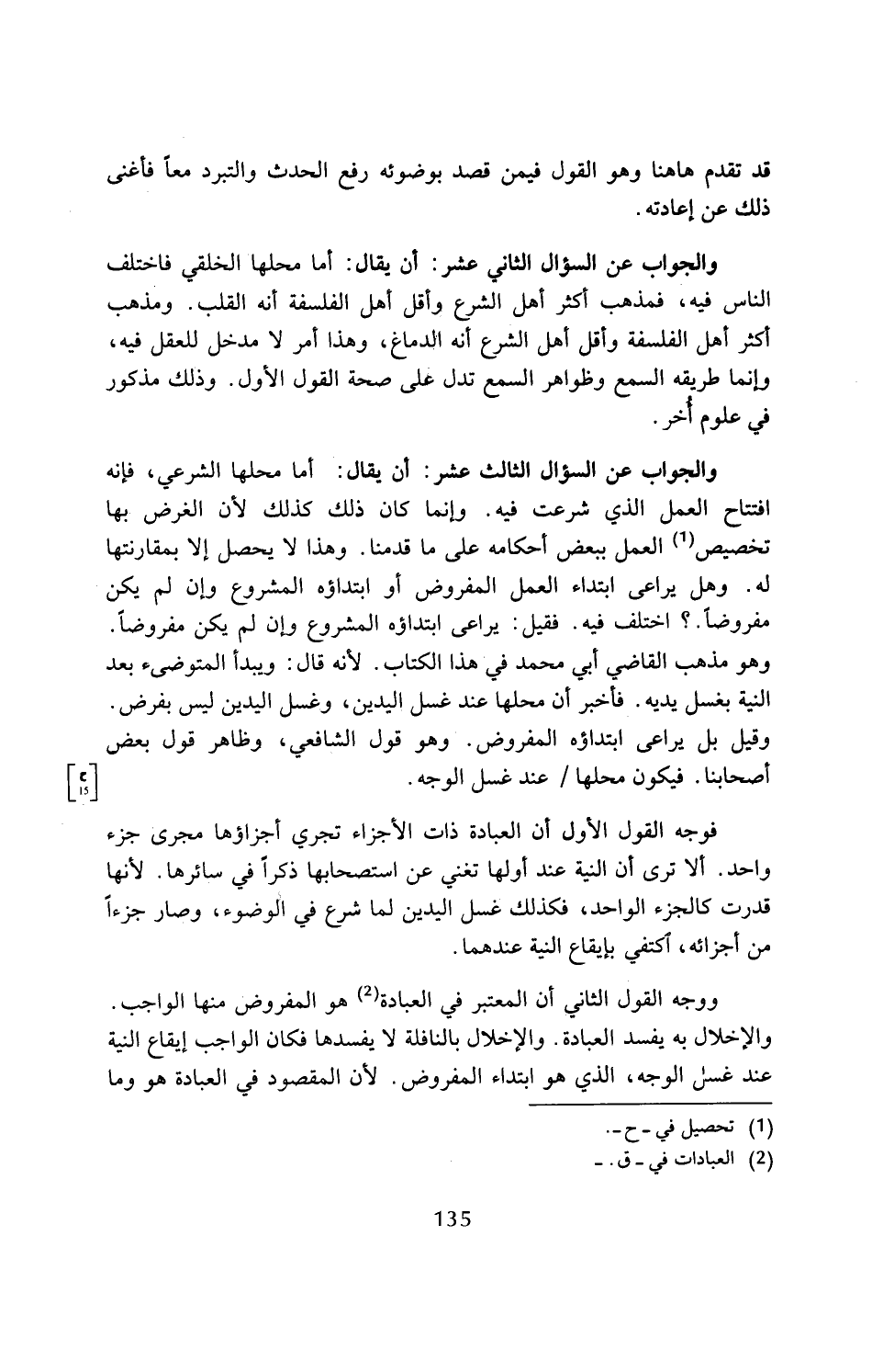 والجواب عن السؤال الثالث عشر: أن يقال: أما محلها الشرعي، فإنه افتتاح العمل الذي شرعت فيه. وإنما كان ذلك كذلك لأن الغرض بها تخصيص (¬1) العمل ببعض أحكامه على ما قدمنا. وهذا لا يحصل إلا بمقارنتها له. وهل يراعى ابتداء العمل المفروض أو ابتداؤه المشروع وإن لم يكن مفروضًا.؟ اختلف فيه. فقيل: يراعى ابتداؤه المشروع وإن لم يكن مفروضًا. وهو مذهب القاضي أبي محمَّد في هذا الكتاب. لأنه قال: ويبدأ المتوضئ بعد النية بغسل يديه. فأخبر أن محلها عند غسل اليدين، وغسل اليدين ليس بفرض. وقيل بل يراعى ابتداؤه المفروض. وهو قول الشافعي، وظاهر قول بعض أصحابنا. فيكون محلها عند غسل الوجه.