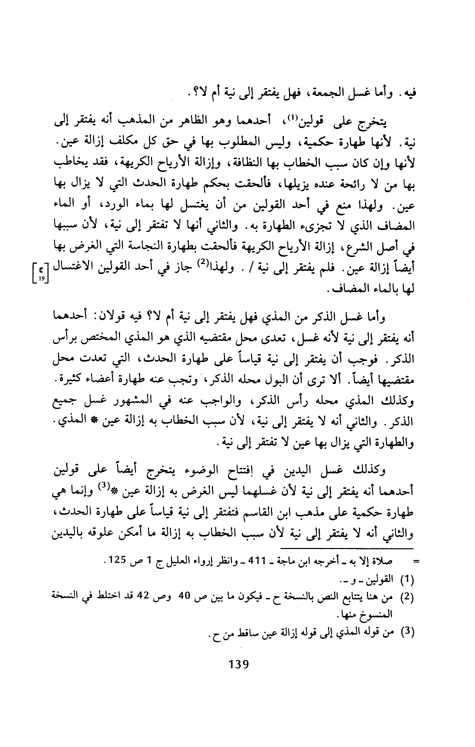 وأما غسل الذكر من المذي فهل يفتقر إلى نية أم لا؟ فيه قولان: أحدهما أنه يفتقر إلى نية لأنه غسل، تعدى محل مقتضيه الذي هو المذي المختص برأس الذكر. فوجب أن يفتقر إلى نية قياسًا على طهارة الحدث، التي تعدت محل مقتضيها أيضًا. ألا ترى أن البول محله الذكر، وتجب عنه طهارة أعضاء كثيرة. وكذلك المذي محله رأس الذكر، والواجب عنه في المشهور غسل جميع الذكر. والثاني أنه لا يفتقر إلى نية، لأن سبب الخطاب به إزالة عين* المذي. والطهارة التي يزال بها عين لا تفتقر إلى نية.