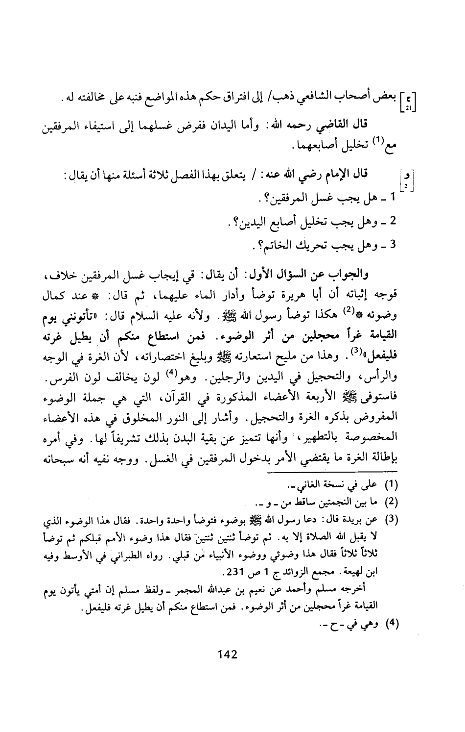 والجواب عن السؤال الأول: أن يقال: في إيجاب غسل المرفقين خلاف، فوجه إثباته أن أبا هريرة توضأ وأدار الماء عليهما، ثم قال: *عند كمال وضوئه* (¬2) هكذا توضأ رسول الله - صلى الله عليه وسلم -. ولأنه عليه السلام قال: "تأتونني يوم القيامة غرًا محجلين من أثر الوضوء. فمن استطاع منكم أن يطيل غرته فليفعل" (¬3). وهذا من مليح استعارته - صلى الله عليه وسلم - وبليغ اختصاراته؛ لأن الغرة في الوجه والرأس، والتحجيل في اليدين والرجلين. وهو (¬4) لون يخالف لون الفرس. فاستوفى - صلى الله عليه وسلم - الأربعة الأعضاء المذكررة في القرآن، التي هي جملة الوضوء المفروض بذكره الغرة والتحجيل. وأشار إلى النور المخلوق في هذه الأعضاء المخصوصة بالتطهير، وأنها تتميز عن بقية البدن بذلك تشريفًا لها. وفي وأمره بإطالة الغرة ما يقتضي الأمر بدخول المرفقين في الغسل. ووجه نفيه أنه سبحانه