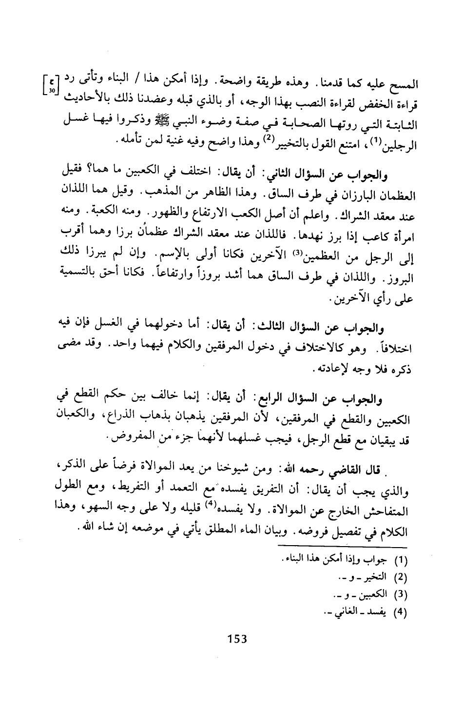 والجواب عن السؤال الثاني: أن يقال: اختلف في الكعبين ما هما؟ فقيل العظمان البارزان في طرف الساق. وهذا الظاهر من المذهب. وقيل هما اللذان عند معقد الشراك. واعلم أن أصل الكتب الارتفاع والظهور. ومنه الكعبة. ومنه امرأة كاعب إذا برز نهدها. فاللذان عند معقد الشراك عظمال برزا وهما أقرب إلى الرجل من العظمين (¬3) الآخرين فكانا أولى بالإسم. وإن لم يبرزا ذلك البروز. واللذان في طرف الساق هما أشد بروزًا وارتفاعًا. فكانا أحق بالتسمية على رأي الآخرين.