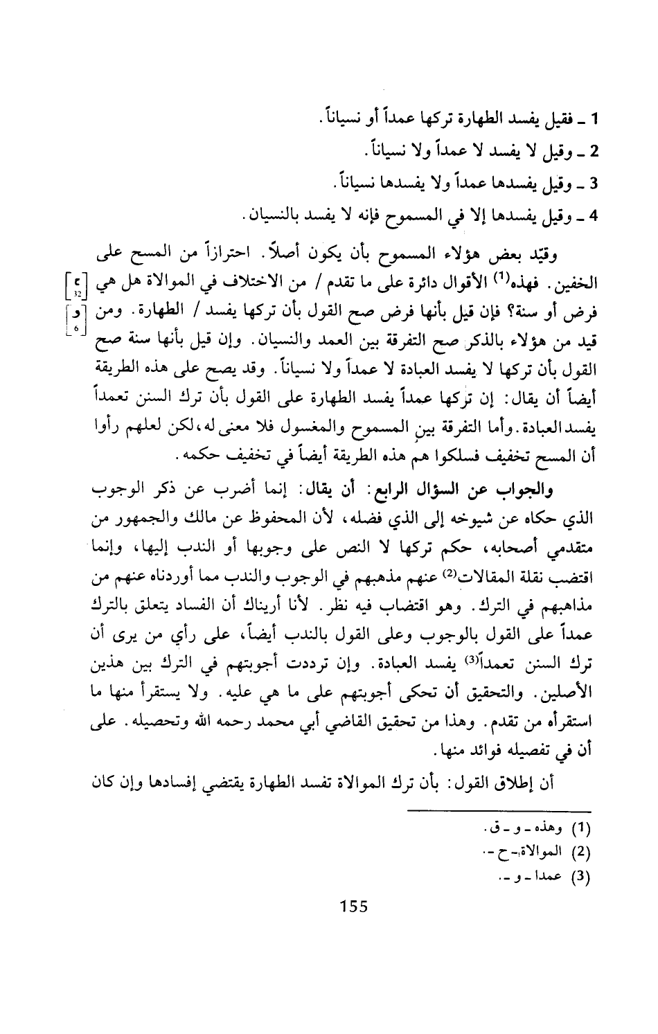 والجواب عن السؤال الرابع: أن يقال: إنما أضرب عن ذكر الوجوب الذي حكاه عن شيوخه إلى الذي فضله؛ لأن المحفوظ عن مالك والجمهور من متقدمي أصحابه، حكم تركها لا النص على وجوبها أو الندب إليها، وإنما اقتضب نقلة المقالات (¬2) عنهم مذهبهم في الوجوب والندب مما أوردناه عنهم من مذاهبهم في الترك. وهو اقتضاب فيه نظر. لأنا أريناك أن الفساد يتعلق بالترك عمدًا على القول بالوجوب وعلى القول بالندب أيضًا، على رأي من يرى أن ترك السنن تعمدًا (¬3) يفسد العبادة. وإن ترددت أجوبتهم في الترك بين هذين الأصلين. والتحقيق أن تحكى أجوبتهم على ما هي عليه. ولا يستقرأ منها ما استقرأه من تقدم. وهذا من تحقيق القاضي أبي محمَّد رحمه الله وتحصيله. على أن في تفصيله فوائد منها.