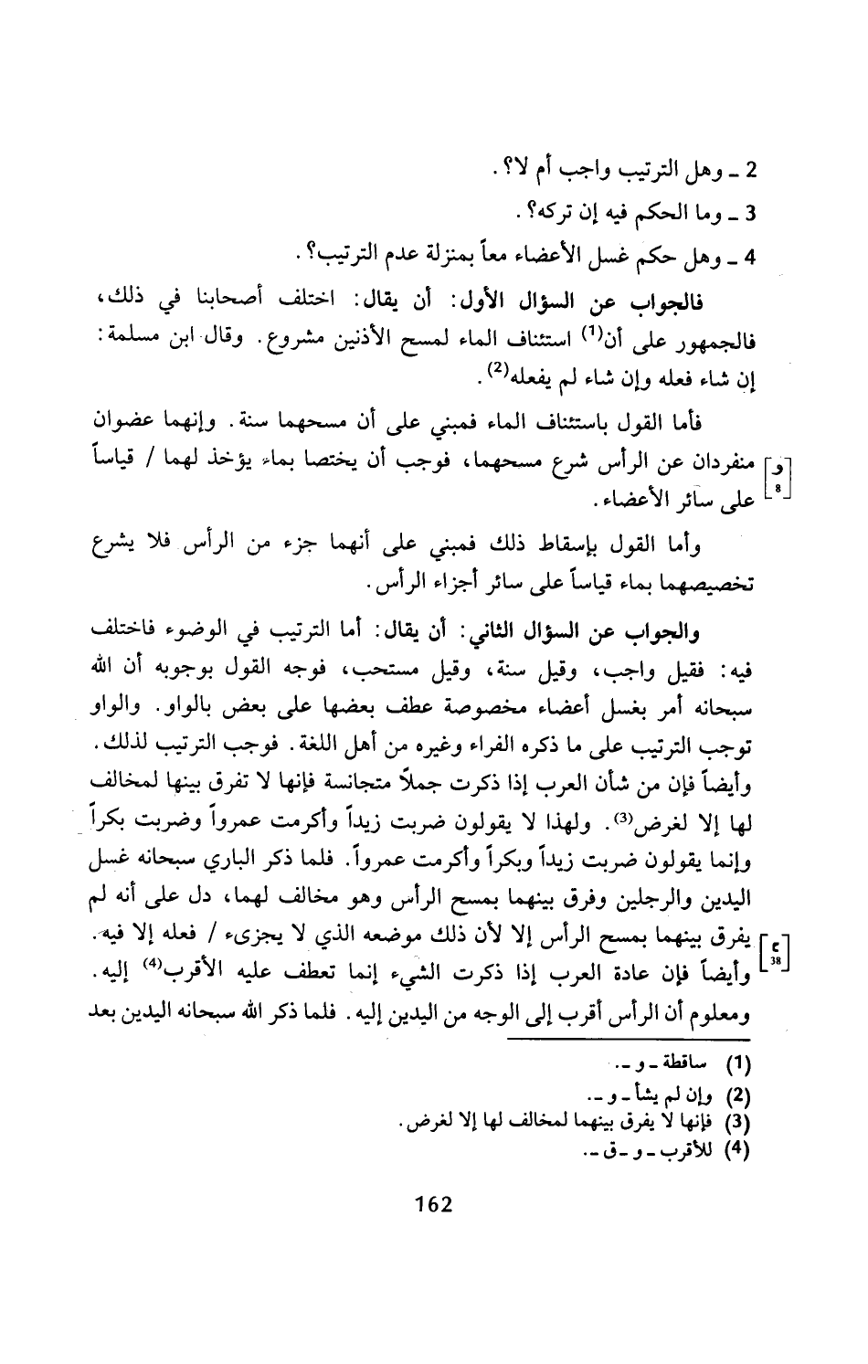 والجواب عن السؤال الثاني: أن يقال: أما الترتيب في الوضوء فاختلف فيه: فقيل واجب، وقيل سنة، وقيل مستحب، فوجه القول بوجوبه أن الله سبحانه أمر بغسل أعضاء مخصوصة عطف بعضها على بعض بالواو. والواو توجب الترتيب على ما ذكره الفراء وغيره من أهل اللغة. فوجب الترتيب لذلك. وأيضًا فإن من شأن العرب إذا ذكرت جملًا متجانسة فإنها لا تفرق بينها لمخالف لها إلا لغرض (¬3). ولهذا لا يقولون ضربت زيدًا وأكرمت عمروًا وضربت بكرًا وإنما يقولون ضربت زيدًا وبكرًا وأكرمت عمروًا. فلما ذكر الباري سبحانه غسل اليدين والرجلين وفرق بينهما بمسح الرأس وهو مخالف لهما، دل على أنه لم يفرق بينهما بمسح الرأس إلا لأن ذلك موضعه الذي لا يجزئ فعله إلا فيه. وأيضًا فإن عادة العرب إذا ذكرت الشيء إنما تعطف عليه الأقرب (¬4) إليه. ومعلوم أن الرأس أقرب إلى الوجه من اليدين إليه. فلما ذكر الله سبحانه اليدين بعد
