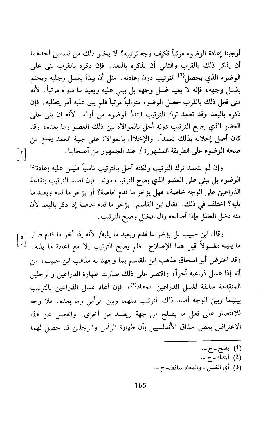 وقد اعترض أبو إسحاق مذهب ابن القاسم بما وجهنا به مذهب ابن حبيب، من أنه إذا غسل ذراعيه آخرًا، واقتصر على ذلك صارت طهارة الذراعين والرجلين المتقدمة سابقة لغسل الذراعين المعاد (¬3)، فإن أعاد غسل الذراعين بالترتيب بينهما وبين الوجه أفسد ذلك الترتيب بينهما وبين الرأس وما بعده. فلا وجه للاقتصار على فعل ما يصلح من جهة ويفسد من أخرى. وانفصل عن هذا الاعتراض بعض حذاق الأندلسيين بأن طهارة الرأس والرجلين قد حصل لهما