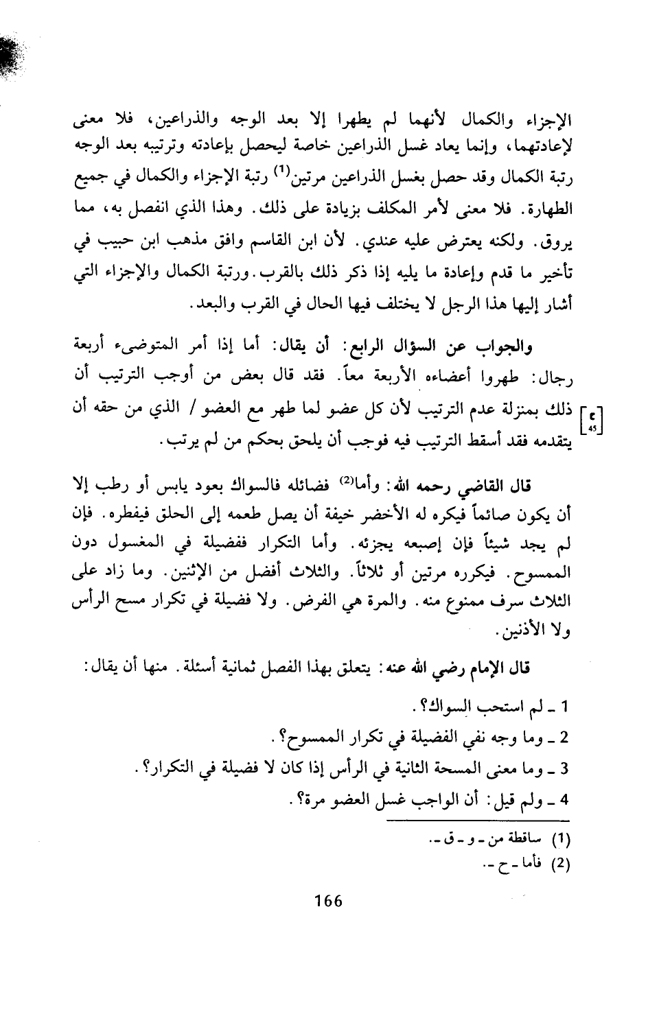 والجواب عن السؤال الرابع: أن يقال: أما إذا أمر المتوضئ أربعة رجال: طهروا أعضاءه الأربعة معًا. فقد قال بعض من أوجب الترتيب أن ذلك بمنزلة عدم الترتيب لأن كل عضو لما طهر مع العضو الذي من حقه أن يتقدمه فقد أسقط الترتيب فيه فوجب أن يلحق بحكم من لم يرتب.