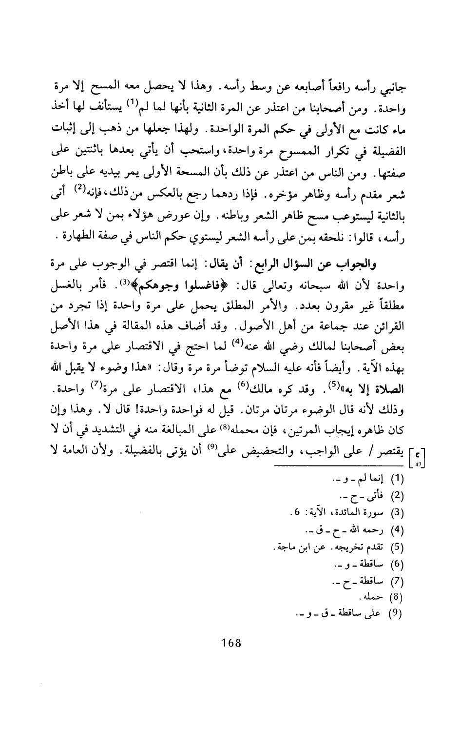 والجواب عن السؤال الرابع: أن يقال: إنما اقتصر في الوجوب على مرة واحدة لأن الله سبحانه وتعالى قال: {فَاغْسِلُوا وُجُوهَكُمْ} (¬3). فأمر بالغسل مطلقًا غير مقرون بعدد. والأمر المطلق يحمل على مرة واحدة إذا تجرد من القرائن عند جماعة من أهل الأصول. وقد أضاف هذه المقالة في هذا الأصل بعض أصحابنا لمالك رضي الله عنه (¬4) لما احتج في الاقتصار على مرة واحدة بهذه الآية. وأيضًا فأنه عليه السلام توضأ مرة مرة وقال: "هذا وضوء لا يقبل الله الصلاة إلا به" (¬5). وقد كره مالك (¬6) مع هذا، الاقتصار على مرة (¬7) واحدة. وذلك لأنه قال الوضوء مرتان مرتان. قيل له فواحدة واحدة! قال لا. وهذا وإن كان ظاهره إيجاب المرتين، فإن محمله (¬8) على المبالغة منه في التشديد في أن لا يقتصر على الواجب، والتحضيض على (¬9) أن يؤتى بالفضيلة. ولأن العامة لا