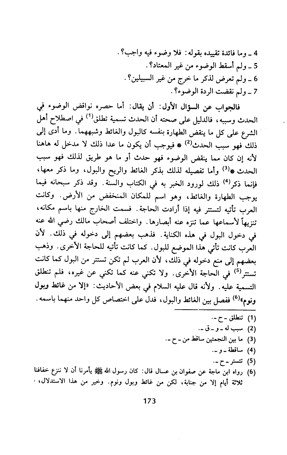 فالجواب عن السؤال الأول: أن يقال: أما حصره نواقض الوضوء في الحدث وسببه، فالدليل على صحته أن الحدث تسمية تطلق (¬1) في اصطلاح أهل الشرع على كل ما ينقض الطهارة بنفسه كالبول والغائط وشبههما. وما أدى إلى ذلك فهو سبب الحدث (¬2) *فيوجب أن يكون ما عدا ذلك لا مدخل له ها هنا لأنه إن كان مما ينقض الوضوء فهو حدث أو ما هو طريق لذلك فهو سبب الحدث* (¬3) وأما تفصيله لذلك بذكر الغائط والريح والبول، وما ذكر معها، فإنما ذكر (¬4) ذلك لورود الخبر به في الكتاب والسنة. وقد ذكر سبحانه فيما يوجب الطهارة والغائط، وهو اسم للمكان المنخفض من الأرض. وكانت العرب تأتيه لتستتر فيه إذا أرادت الحاجة. فسمت الخارج منها باسم مكانه، تنزيهًا لأسماعها عما تنزه عنه أبصارها. واختلف أصحاب مالك رضي الله عنه في دخول البول في هذه الكناية. فذهب بعضهم إلى دخوله في ذلك. لأن العرب كانت تأتي هذا الموضع للبول. كما كانت تأتيه للحاجة الأخرى. وذهب بعضهم إلى منع دخوله في ذلك؛ لأن العرب لم تكن تستتر من البول كما كانت تستتر (¬5) في الحاجة الأخرى. ولا تكني عنه كما تكني عن غيره، فلم تنطلق التسمية عليه. ولأنه قال عليه السلام في بعض الأحاديث: "إلا من غائط وبول ونوم" (¬6) ففصل بين الغائط والبول، فدل على اختصاص كل واحد منهما باسمه.