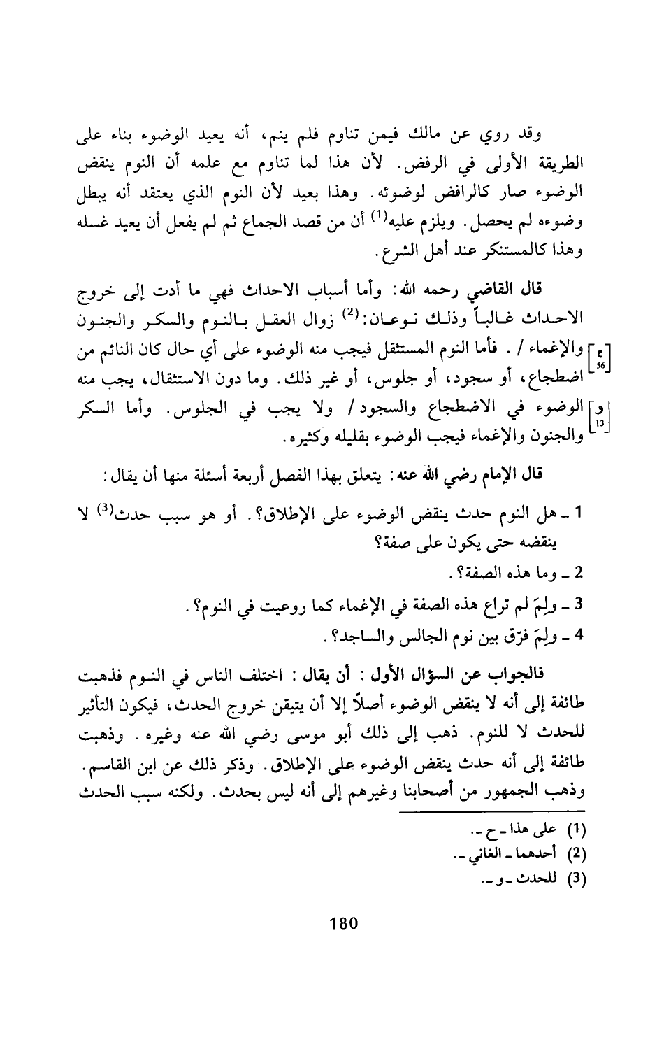فالجواب عن السؤال الأول: أن يقال: اختلف الناس في النوم فذهبت طائفة إلى أنه لا ينقض الوضوء أصلًا إلا أن يتيقن خروج الحدث، فيكون التأثير للحدث لا للنوم. ذهب إلى ذلك أبو موسى رضي الله عنه وغيره. وذهبت طائفة إلى أنه حدث ينقض الوضوء على الإطلاق. وذكر ذلك عن ابن القاسم. وذهب الجمهور من أصحابنا وغيرهم إلى أنه ليس بحدث. ولكنه سبب الحدث