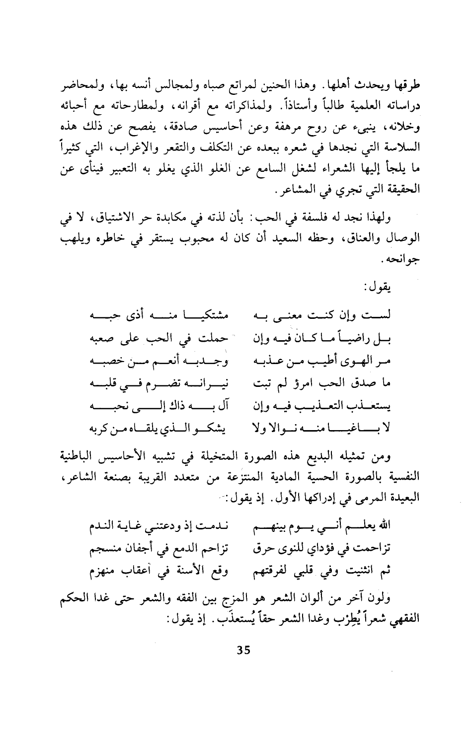 طرقها ويحدث أهلها. وهذا الحنين لمراتع صباه ولمجالس أنسه بها، ولمحاضر دراساته العلمية طالبًا وأستاذًا. ولمذاكراته مع أقرانه، ولمطارحاته مع أحبائه وخلانه، ينبىء عن روح مرهفة وعن أحاسيس صادقة، يفصح عن ذلك هذه السلاسة التي نجدها في شعره ببعده عن التكلف والتقعر والإغراب، التي كثيرًا ما يلجأ إليها الشعراء لشغل السامع عن الغلو الذي يغلو به التعبير فينأى عن الحقيقة التي تجري في المشاعر.