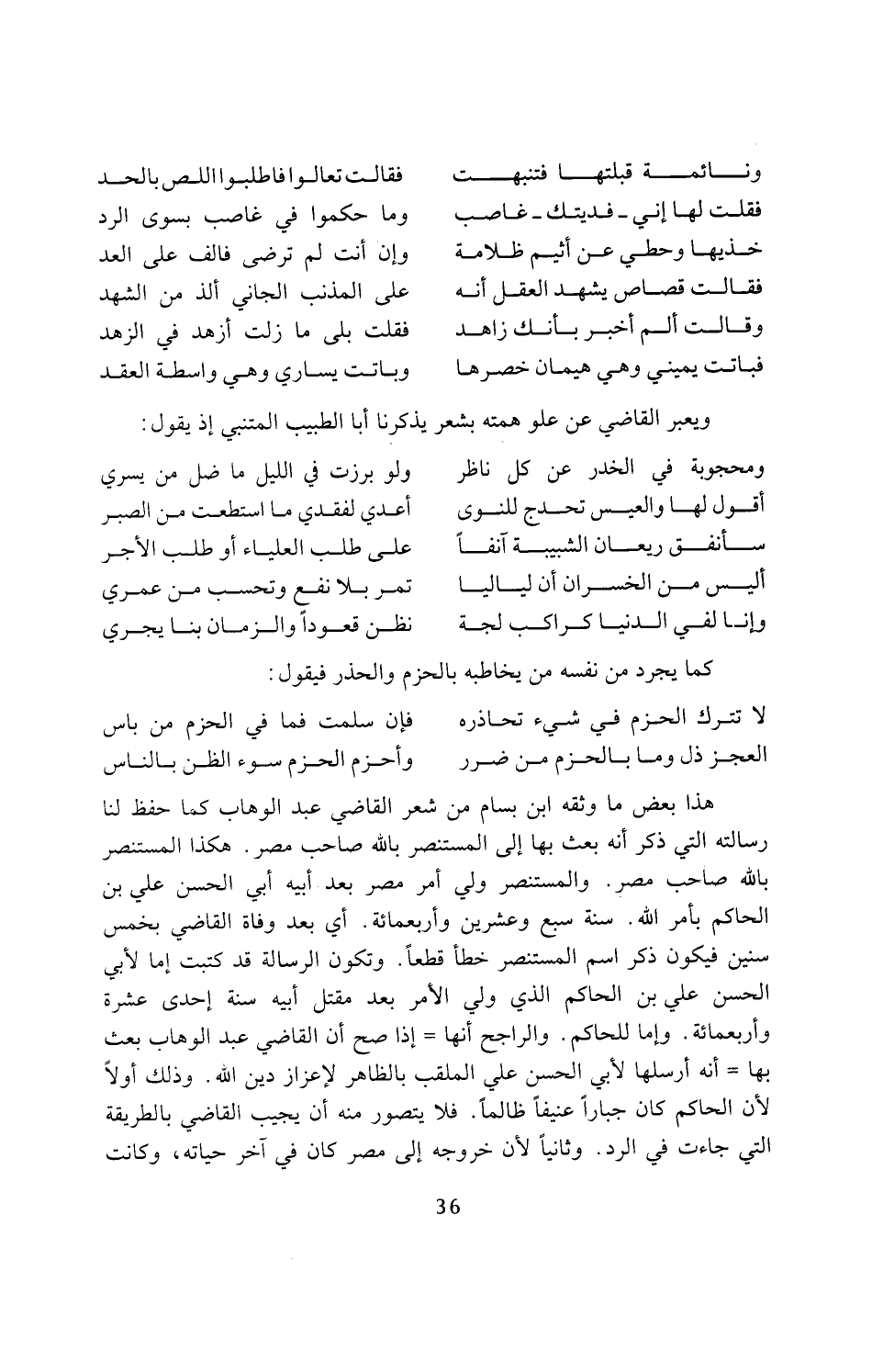 هذا بعض ما وثقه ابن بسام من شعر القاضي عبد الوهاب كما حفظ لنا رسالته التي ذكر أنه بعث بها إلى المستنصر بالله صاحب مصر. هكذا المستنصر بالله صاحب مصر. والمستنصر ولي أمر مصر بعد أبيه أبي الحسن علي بن الحاكم بأمر الله. سنة سبع وعشرين وأربعمائة. أي بعد وفاة القاضي بخمس سنين فيكون ذكر اسم المستنصر خطأ قطعًا. وتكون الرسالة قد كتبت إما لأبي الحسن علي بن الحاكم الذي ولي الأمر بعد مقتل أبيه سنة إحدى عشرة وأربعمائة. وإما للحاكم. والراجح أنها =إذا صح أن القاضي عبد الوهاب بعث بها= أنه أرسلها لأبي الحسن علي الملقب بالظاهر لإعزاز دين الله. وذلك أولًا لأن الحاكم كان جبارًا عنيفًا ظالمًا. فلا يتصور منه أن يجيب القاضي بالطريقة التي جاءت في الرد. وثانيًا لأن خروجه إلى مصر كان في آخر حياته، وكانت