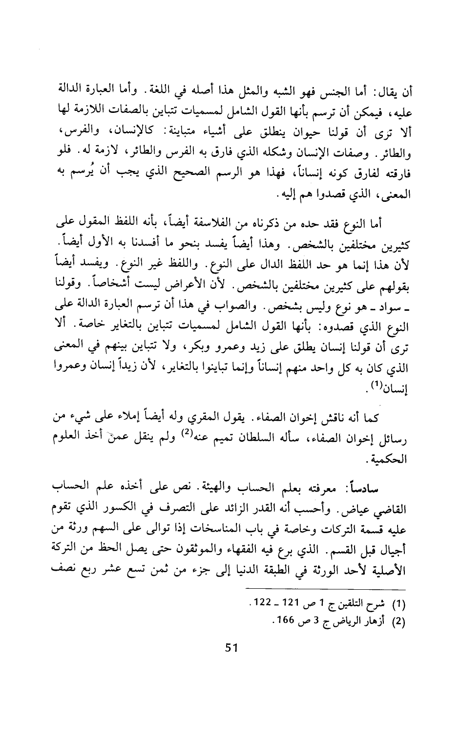 أما النوع فقد حده من ذكرناه من الفلاسفة أيضًا، بأنه اللفظ المقول على كثيرين مختلفين بالشخص. وهذا أيضًا يفسد بنحو ما أفسدنا به الأول أيضًا. لأن هذا إنما هو حد اللفظ الدال على النوع. واللفظ غير النوع. ويفسد أيضًا بقولهم على كثيرين مختلفين بالشخص. لأن الأعراض ليست أشخاصًا. وقولنا - سواد- هو نوع وليس بشخص. والصواب في هذا أن ترسم العبارة الدالة على النوع الذي قصدوه: بأنها القول الشامل لمسميات تتباين بالتغاير خاصة. ألا ترى أن قولنا إنسان يطلق على زيد وعمرو وبكر، ولا تتباين بينهم في المعنى الذي كان به كل واحد منهم إنسانًا وإنما تباينوا بالتغاير؛ لأن زيدًا إنسان وعمروا إنسان (¬1).