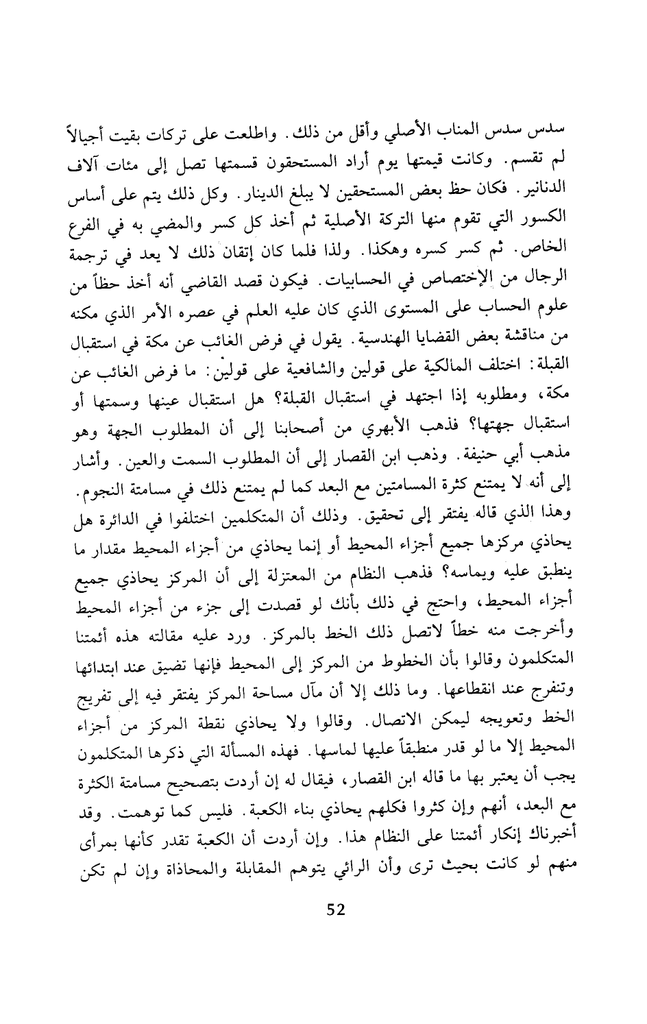 سدس سدس المناب الأصلي وأقل من ذلك. واطلعت على تركات بقيت أجيالًا لم تقسم. وكانت قيمتها يوم أراد المستحقون قسمتها تصل إلى مئات آلاف الدنانير. فكان حظ بعض المستحقين لا يبلغ الدينار. وكل ذلك يتم على أساس الكسور التي تقوم منها التركة الأصلية ثم أخذ كل كسر والمضي به في الفرع الخاص. ثم كسر كسره وهكذا. ولذا فلما كان إتقان ذلك لا يعد في ترجمة الرجال من الإختصاص في الحسابيات. فيكون قصد القاضي أنه أخذ حظًا من علوم الحساب على المستوى الذي كان عليه العلم في عصره الأمر الذي مكنه من مناقشة بعض القضايا الهندسية. يقول في فرض الغائب عن مكة في استقبال القبلة: اختلف المالكية على قولين والشافعية على قولين: ما فرض الغائب عن مكة، ومطلوبه إذا اجتهد في استقبال القبلة؟ هل استقبال عينها وسمتها أو استقبال جهتها؟ فذهب الأبهري من أصحابنا إلى أن المطلوب الجهة وهو مذهب أبي حنيفة. وذهب ابن القصار إلى أن المطلوب السمت والعين. وأشار إلى أنه لا يمتنع كثرة المسامتين مع البعد كما لم يمتنع ذلك في مسامتة النجوم. وهذا الذي قاله يفتقر إلى تحقيق. وذلك أن المتكلمين اختلفوا في الدائرة هل يحاذي مركزها جميع أجزاء المحيط أو إنما يحاذي من أجزاء المحيط مقدار ما ينطبق عليه ويماسه؟ فذهب النظام من المعتزلة إلى أن المركز يحاذي جميع أجزاء المحيط، واحتج في ذلك بأنك لو قصدت إلى جزء من أجزاء المحيط وأخرجت منه خطًا لاتصل ذلك الخط بالمركز. ورد عليه مقالته هذه أئمتنا المتكلمون وقالوا بأن الخطوط من المركز إلى المحيط فإنها تضيق عند ابتدائها وتنفرج عند انقطاعها. وما ذلك إلا أن مآل مساحة المركز يفتقر فيه إلى تفريج الخط وتعويجه ليمكن الاتصال. وقالوا ولا يحاذي نقطة المركز من أجزاء المحيط إلا ما لو قدر منطبقًا عليها لماسها. فهذه المسألة التي ذكرها المتكلمون يجب أن يعتبر بها ما قاله ابن القصار، فيقال له إن أردت بتصحيح مسامتة الكثرة مع البعد، أنهم وإن كثروا فكلهم يحاذي بناء الكعبة. فليس كما توهمت. وقد أخبرناك إنكار أئمتنا على النظام هذا. وإن أردت أن الكعبة تقدر كأنها بمرأى منهم لو كانت بحيث ترى وأن الرائي يتوهم المقابلة والمحاذاة وإن لم تكن