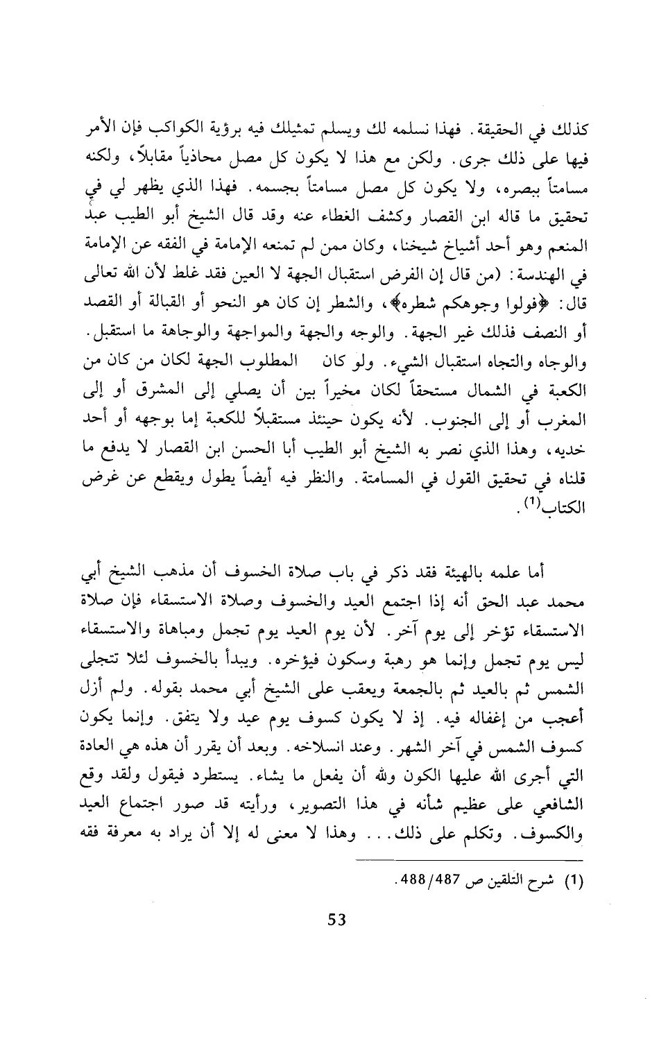 كذلك في الحقيقة. فهذا نسلمه لك ويسلم تمثيلك فيه برؤية الكواكب فإن الأمر فيها على ذلك جرى. ولكن مع هذا لا يكون كل فصل محاذيًا مقابلًا، ولكنه مسامتًا ببصره، ولا يكون كل فصل مسامتًا بجسمه. فهذا الذي يظهر لي في تحقيق ما قاله ابن القصار وكشف الغطاء عنه وقد قال الشيخ أبو الطيب عبد المنعم وهو أحد أشياخ شيخنا، وكان ممن لم تمنعه الإمامة في الفقه عن الإمامة في الهندسة: (من قال إن الفرض استقبال الجهة لا العين فقد غلط لأن الله تعالى قال: {فولوا وجوهكم شطره}، والشطر إن كان هو النحو أو القبالة أو القصد أو النصف فذلك غير الجهة. والوجه والجهة والمواجهة والوجاهة ما استقبل. والوجاه والتجاه استقبال الشيء. ولو كان المطلوب الجهة لكان من كان من الكعبة في الشمال مستحقًا لكان مخيرًا بين أن يصلي إلى المشرق أو إلى المغرب أو إلى الجنوب. لأنه يكون حينئذ مستقبلًا للكعبة إما بوجهه أو أحد خديه، وهذا الذي نصر به الشيخ أبو الطيب أبا الحسن ابن القصار لا يدفع ما قلناه في تحقيق القول في المسامتة. والنظر فيه أيضًا يطول ويقطع عن غرض الكتاب (¬1).