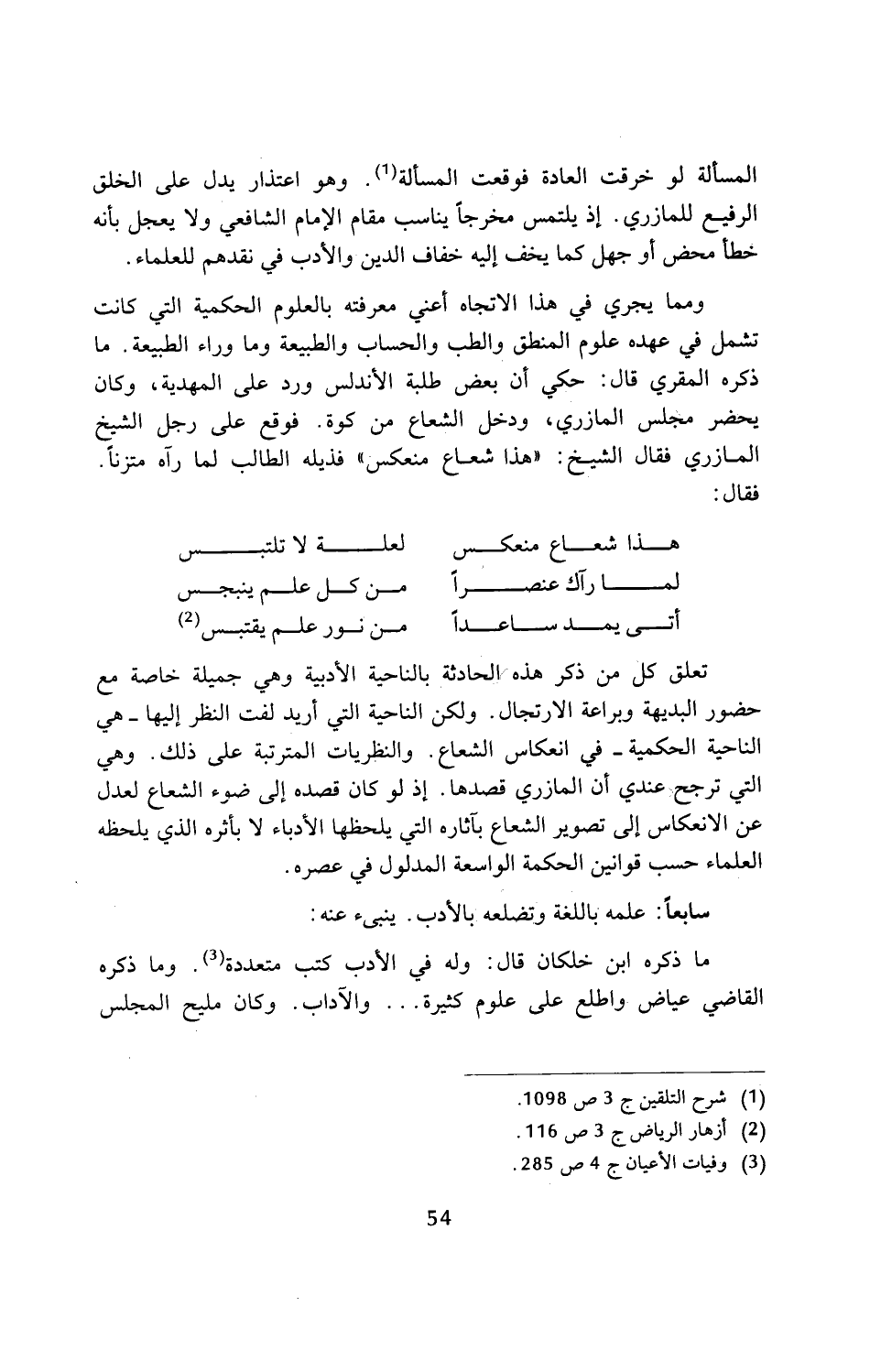 المسألة لو خرقت العادة فوقعت المسألة (¬1). وهو اعتذار يدل على الخلق الرفيع للمازري. إذ يلتمس مخرجًا يناسب مقام الإِمام الشافعي ولا يعجل بأنه خطأ محض أو جهل كما يخف إليه خفاف الدين والأدب في نقدهم للعلماء.