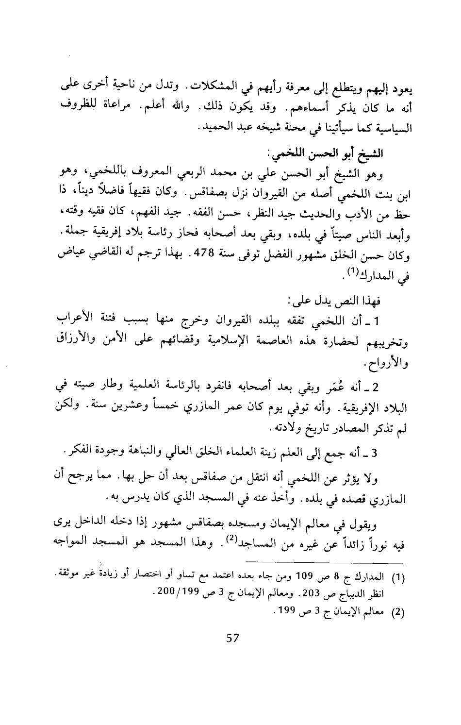 وهو الشيخ أبو الحسن علي بن محمَّد الربعي المعروف باللخمي، وهو ابن بنت اللخمي أصله من القيروان نزل بصفاقس. وكان فقيهًا فاضلًا دينًا، ذا حظ من الأدب والحديث جيد النظر، حسن الفقه. جيد الفهم، كان فقيه وقته، وأبعد الناس صيتًا في بلده، وبقي بعد أصحابه فحاز رئاسة بلاد إفريقية جملة. وكان حسن الخلق مشهور الفضل توفي سنة 478. بهذا ترجم له القاضي عياض في المدارك (¬1).