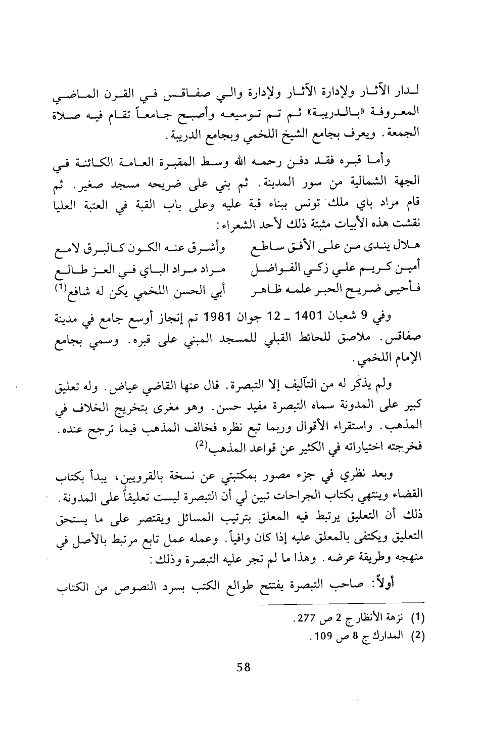 وفي 9 شعبان 1401 - 12 جوان 1981 تم إنجاز أوسع جامع في مدينة صفاقس. ملاصق للحائط القبلي للمسجد المبني على قبره. وسمي بجامع الإِمام اللخمي. ولم يذكر له من التآليف إلا التبصرة. قال عنها القاضي عياض. وله تعليق كبير على المدونة سماه التبصرة مفيد حسن. وهو مغرى بتخريج الخلاف في المذهب. واستقراء الأقوال وربما تبع نظره فخالف المذهب فيما ترجح عنده. فخرجته اختياراته في الكثير عن قواعد المذهب (¬2)