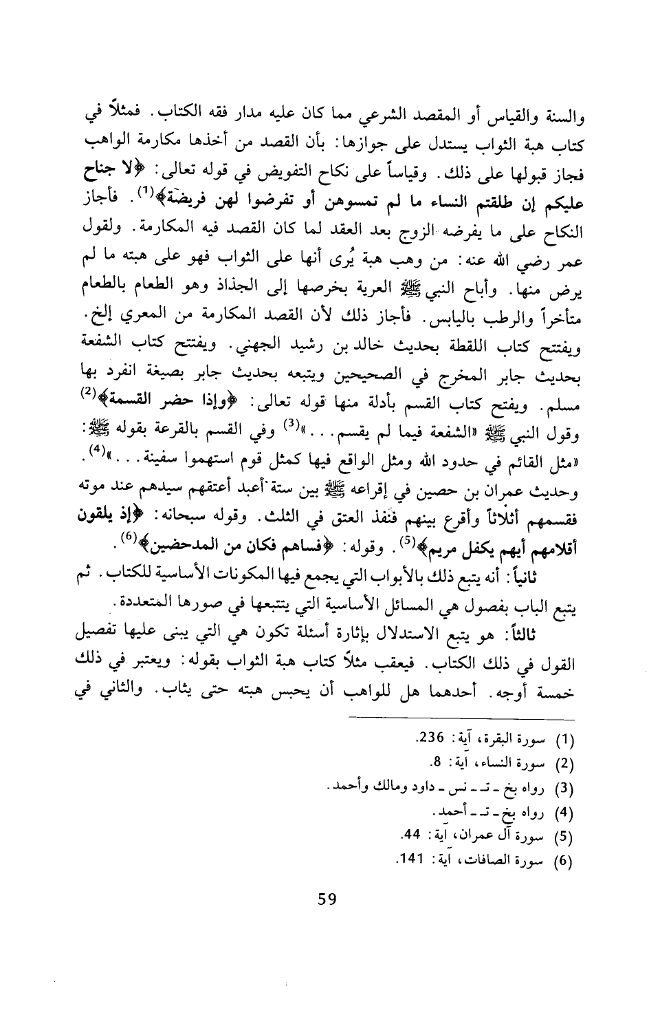 والسنة والقياس أو المقصد الشرعي مما كان عليه مدار فقه الكتاب. فمثلًا في كتاب هبة الثواب يستدل على جوازها: بأن القصد من أخذها مكارمة الواهب فجاز قبولها على ذلك. وقياسًا على نكاح التفويض في قوله تعالى: {لَا جُنَاحَ عَلَيْكُمْ إِنْ طَلَّقْتُمُ النِّسَاءَ مَا لَمْ تَمَسُّوهُنَّ أَوْ تَفْرِضُوا لَهُنَّ فَرِيضَةً} (¬1). فأجاز النكاح على ما يفرضه الزوج بعد العقد لما كان القصد فيه المكارمة. ولقول عمر رضي الله عنه: من وهب هبة يُرى أنها على الثواب فهو على هبته ما لم يرض منها. وأباح النبي - صلى الله عليه وسلم - العرية بخرصها إلى الجذاذ وهو الطعام بالطعام متأخرًا والرطب باليابس. فأجاز ذلك لأن القصد المكارمة من المعري إلخ. ويفتتح كتاب اللقطة بحديث خالد بن رشيد الجهني. ويفتتح كتاب الشفعة بحديث جابر المخرج في الصحيحين ويتبعه بحديث جابر بصيغة انفرد بها مسلم. ويفتح كتاب القسم بأدلة منها قوله تعالى: {وإذا حضر القسمة} (¬2) وقول النبي - صلى الله عليه وسلم - "الشفعة فيما لم يقسم ... " (¬3) وفي القسم بالقرعة بقوله - صلى الله عليه وسلم -: "مثل القائم في حدود الله ومثل الواقع فيها كمثل قوم استهموا سفينة ... " (¬4). وحديث عمران بن حصين في إقراعه - صلى الله عليه وسلم - بين ستة أعبد أعتقهم سيدهم عند موته فقسمهم أثلاثًا وأقرع بينهم فنفذ العتق في الثلث. وقوله سبحانه: {إِذْ يُلْقُونَ أَقْلَامَهُمْ أَيُّهُمْ يَكْفُلُ مَرْيَمَ} (¬5). وقوله: {فَسَاهَمَ فَكَانَ مِنَ الْمُدْحَضِينَ} (¬6).