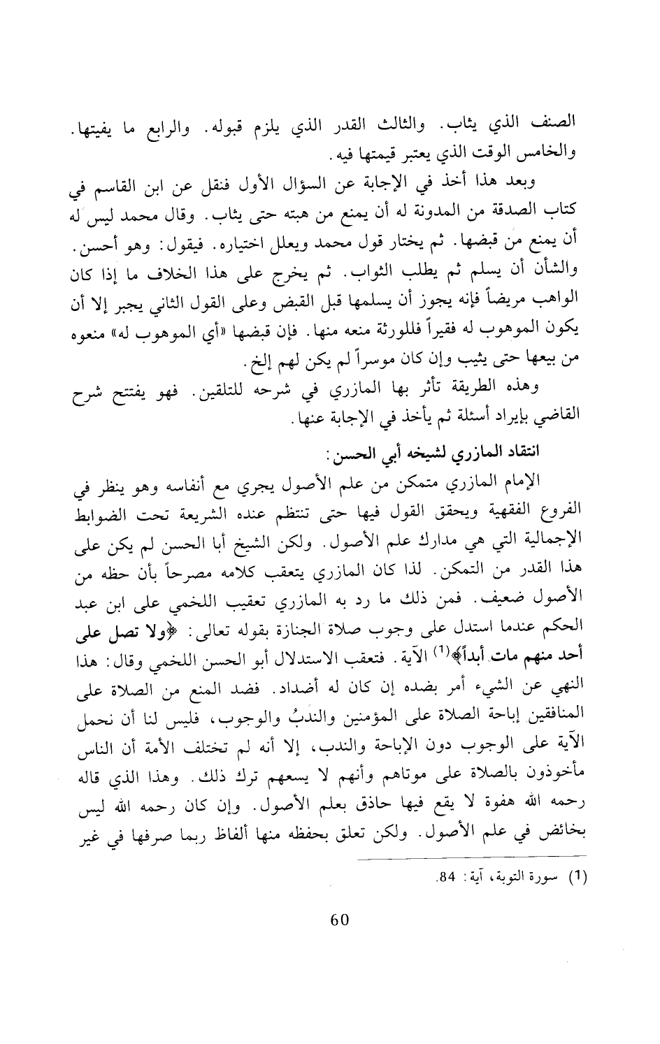 الإِمام المازري متمكن من علم الأصول يجري مع أنفاسه وهو ينظر في الفروع الفقهية ويحقق القول فيها حتى تنتظم عنده الشريعة تحت الضوابط الإجمالية التي هي مدارك علم الأصول. ولكن الشيخ أبا الحسن لم يكن على هذا القدر من التمكن. لذا كان المازري يتعقب كلامه مصرحًا بأن حظه من الأصول ضعيف. فمن ذلك ما رد به المازري تعقيب اللخمي على ابن عبد الحكم عندما استدل على وجوب صلاة الجنازة بقوله تعالى. {ولا تصل على أحد منهم مات أبدًا} (¬1) الآية. فتعقب الاستدلال أبو الحسن اللخمي وقال: هذا النهي عن الشيء أمر بضده إن كان له أضداد. فضد المنع من الصلاة على المنافقين إباحة الصلاة على المؤمنين والندبُ والوجوب، فليس لنا أن نحمل الآية على الوجوب دون الإباحة والندب، إلا أنه لم تختلف الأمة أن الناس مأخوذون بالصلاة على موتاهم وأنهم لا يسعهم ترك ذلك. وهذا الذي قاله رحمه الله هفوة لا يقع فيها حاذق بعلم الأصول. وإن كان رحمه الله ليس بخائض في علم الأصول. ولكن تعلق بحفظه منها ألفاظ ربما صرفها في غير