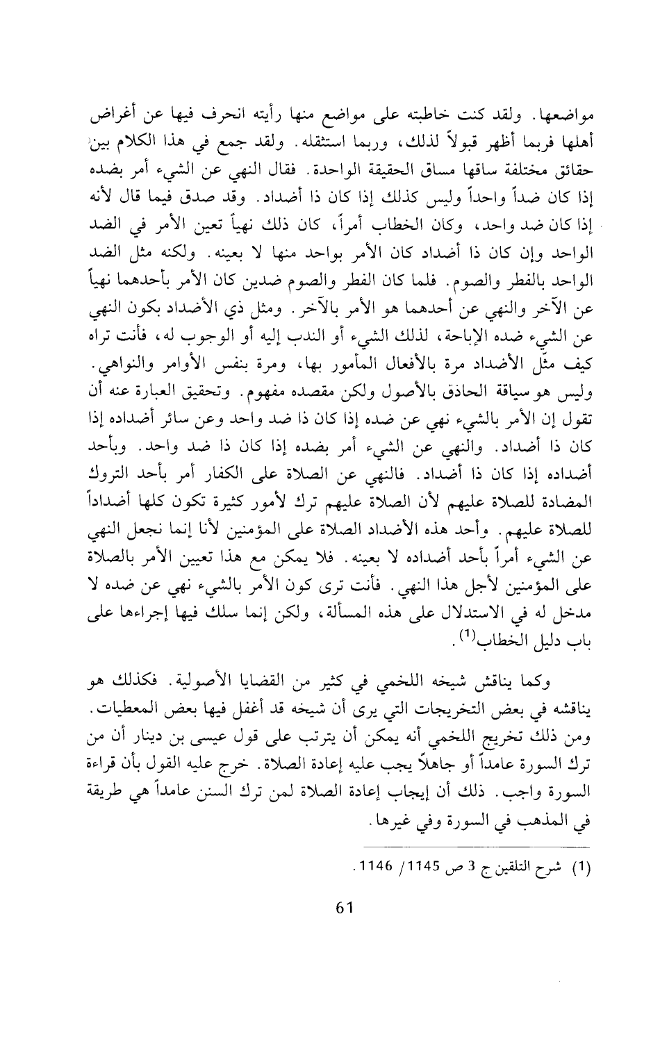 مواضعها. ولقد كنت خاطبته على مواضع منها رأيته انحرف فيها عن أغراض أهلها فربما أظهر قبولًا لذلك، وربما استثقله. ولقد جمع في هذا الكلام بين حقائق مختلفة ساقها مساق الحقيقة الواحدة. فقال النهي عن الشيء أمر بضده إذا كان ضدًا واحدًا وليس كذلك إذا كان ذا أضداد. وقد صدق فيما قال لأنه إذا كان ضد واحد، وكان الخطاب أمرًا، كان ذلك نهيًا تعين الأمر في الضد الواحد وإن كان ذا أضداد كان الأمر بواحد منها لا بعينه. ولكنه مثل الضد الواحد بالفطر والصوم. فلما كان الفطر والصوم ضدين كان الأمر بأحدهما نهيًا عن الآخر والنهي عن أحدهما هو الأمر بالآخر. ومثل ذي الأضداد يكون النهي عن الشيء ضده الإباحة، لذلك الشيء أو الندب إليه أو الوجوب له، فأنت تراه كيف مثّل الأضداد مرة بالأفعال المأمور بها، ومرة بنفس الأوامر والنواهي. وليس هو سياقة الحاذق بالأصول ولكن مقصده مفهوم. وتحقيق العبارة عنه أن تقول إن الأمر بالشيء نهي عن ضده إذا كان ذا ضد واحد وعن سائر أضداده إذا كان ذا أضداد. والنهي عن الشيء أمر بضده إذا كان ذا ضد واحد. وبأحد أضداده إذا كان ذا أضداد. فالنهي عن الصلاة على الكفار أمر بأحد التروك المضادة للصلاة عليهم لأن الصلاة عليهم ترك لأمور كثيرة تكون كلها أضدادًا للصلاة عليهم. واحد هذه الأضداد الصلاة على المؤمنين لأنا إنما نجعل النهي عن الشيء أمرًا بأحد أضداده لا بعينه. فلا يمكن هذا تعيين الأمر بالصلاة على المؤمنين لأجل هذا النهي. فأنت ترى كون الأمر بالشيء نهي عن نحمده لا مدخل له في الاستدلال على هذه المسألة، ولكن إنما سلك فيها إجراءها على باب دليل الخطاب (¬1).