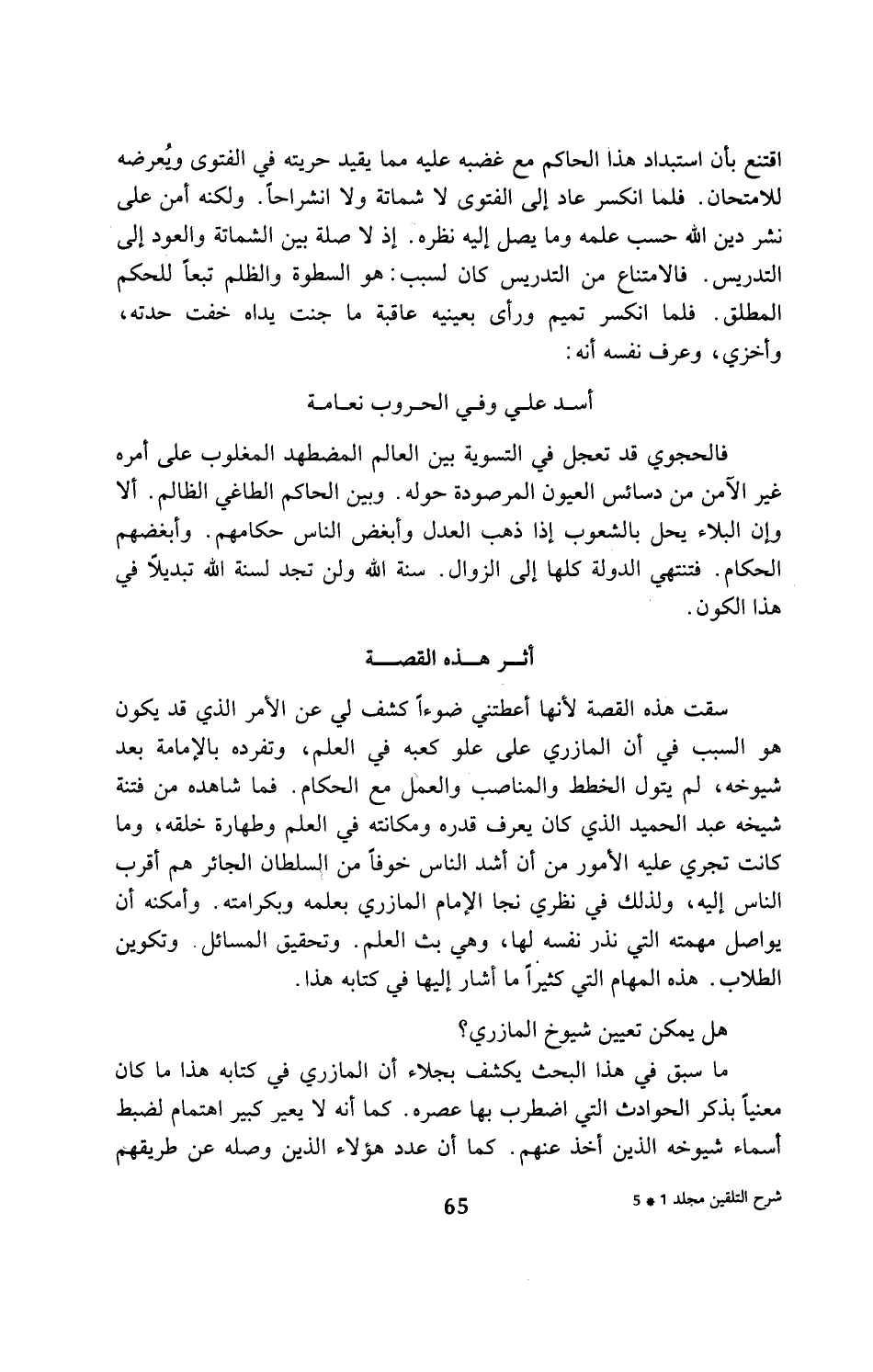 سقت هذه القصة لأنها أعطتني ضوءًا كشف لي عن الأمر الذي قد يكون هو السبب في أن المازري على علو كعبه في العلم، وتفرده بالإمامة بعد شيوخه، لم يتول الخطط والمناصب والعمل مع الحكام. فما شاهده من فتنة شيخه عبد الحميد الذي كان يعرف قدره ومكانته في العلم وطهارة خلقه، وما كانت تجري عليه الأمور من أن أشد الناس خوفًا من السلطان الجائر هم أقرب الناس إليه، ولذلك في نظري نجا الإِمام المازري بعلمه وبكرامته. وأمكنه أن يواصل مهمته التي نذر نفسه لها، وهي بث العلم. وتحقيق المسائل. وتكوين الطلاب. هذه المهام التي كثيرًا ما أشار إليها في كتابه هذا.