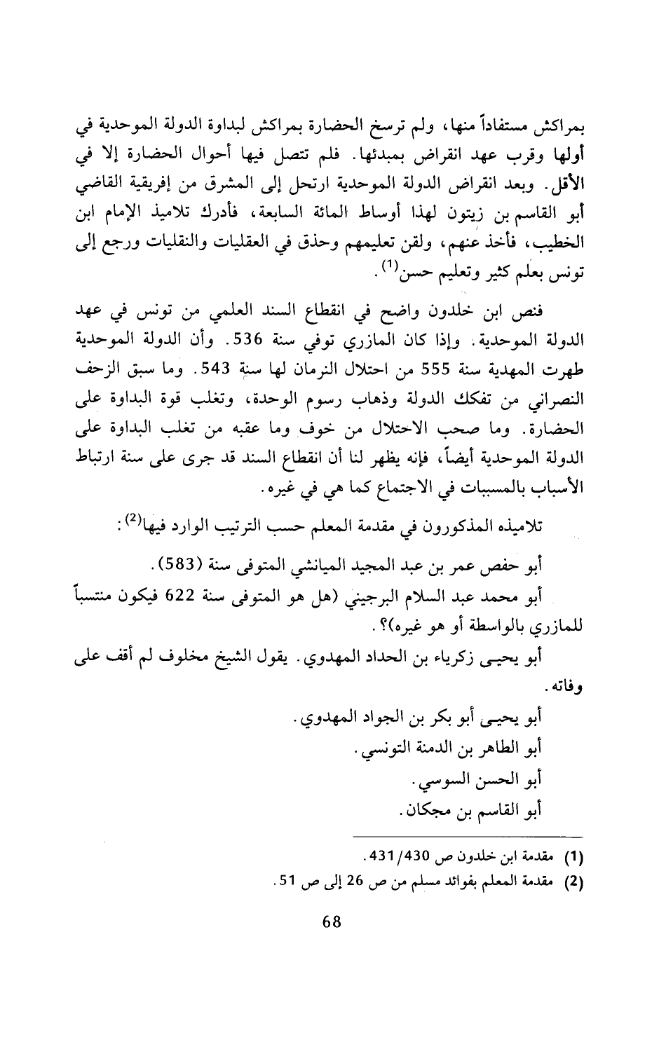 فنص ابن خلدون واضح في انقطاع السند العلمي من تونس في عهد الدولة الموحدية. وإذا كان المازري توفي سنة 536. وأن الدولة الموحدية طهرت المهدية سنة 555 من احتلال النرمان لها سية 543. وما سبق الزحف النصراني من تفكك الدولة وذهاب رسوم الوحدة، وتغلب قوة البداوة على الحضارة. وما صحب الاحتلال من خوف وما عقبه من تغلب البداوة على الدولة الموحدية أيضًا، فإنه يظهر لنا أن انقطاع السند قد جرى على سنة ارتباط الأسباب بالمسببات في الاجتماع كما هي في غيره.