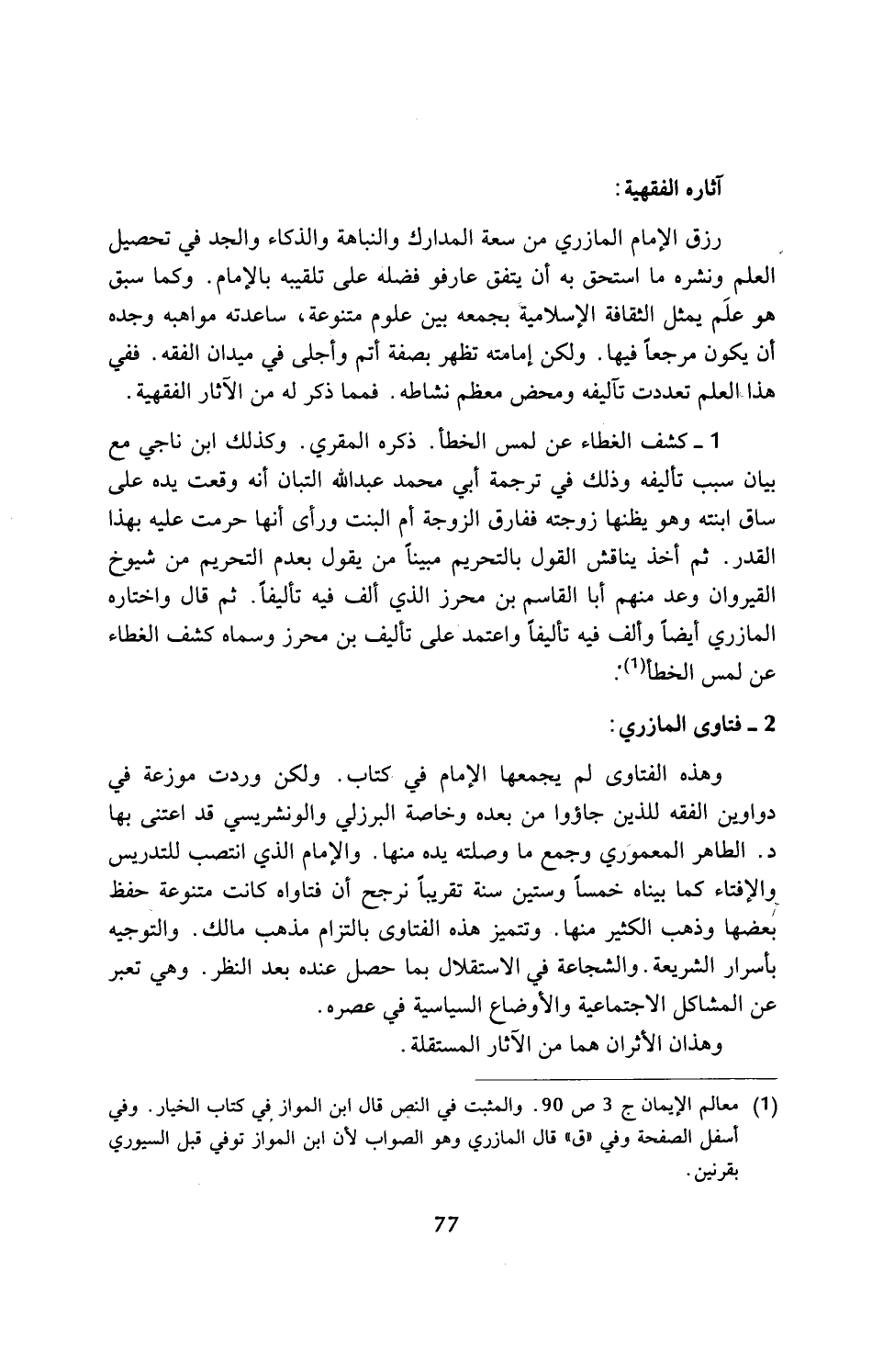 1 - كشف الغطاء عن لمس الخطأ. ذكره المقري. وكذلك ابن ناجي مع بيان سبب تاليفه وذلك في ترجمة أبي محمَّد عبد الله التبان أنه وقعت يده على ساق ابنته وهو يظنها زوجته ففارق الزوجة أم البنت ورأى أنها حرمت عليه بهذا القدر. ثم أخذ يناقش القول بالتحريم مبينًا من يقول بعدم التحريم من شيوخ القيروان وعد منهم أبا القاسم بن محرز الذي ألف فيه تأليفًا. ثم قال واختاره المازري أيضًا وألف فيه تأليفًا واعتمد على تأليف بن محرز وسماه كشف الغطاء عن لمس الخطأ (¬1).