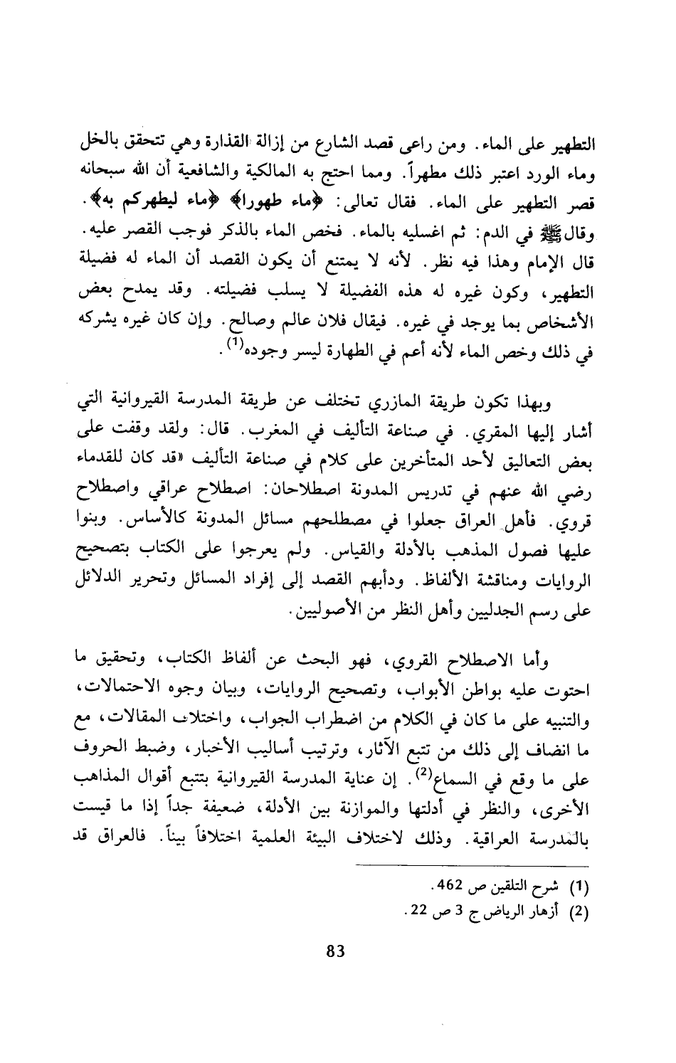 وبهذا تكون طريقة المازري تختلف عن طريقة المدرسة القيروانية التي أشار إليها المقري. في صناعة التأليف في المغرب. قال: ولقد وقفت على بعض التعاليق لأحد المتأخرين على كلام في صناعة التأليف "قد كان للقدماء رضي الله عنهم في تدريس المدونة اصطلاحان: اصطلاح عراقي واصطلاح قروي. فاهل العراق جعلوا في مصطلحهم مسائل المدونة كالأساس. وبنوا عليها فصول المذهب بالأدلة والقياس. ولم يعرجوا على الكتاب بتصحيح الروايات ومناقشة الألفاظ. ودأبهم القصد إلى إفراد المسائل وتحرير الدلائل على رسم الجدليين وأهل النظر من الأصوليين.