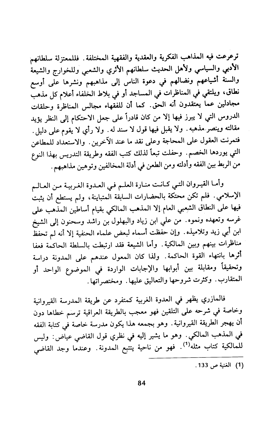 وأما القيروان التي كانت منارة العلم في العدوة الغربية من العالم الإِسلامي. فلم تكن محتكة بالحضارات السابقة المتباينة، ولم يستطع أن يثبت فيها على النطاق الشعبي العام إلا المذهب المالكي بقيام أساطين المذهب على غرسه وتعهده ونموه. من علي ابن زياد والبهلول بن راشد وسحنون إلى الشيخ ابن أبي زيد وتلاميذه. وإن حفظت أسماء لبعض علماء الحنفية إلا أنه لم تحفظ مناظرات بينهم وبين المالكية. وأما الشيعة فقد ارتبطت بالسلطة الحاكمة فعفا أثرها بانتهاء القوة الحاكمة. ولذا كان المعول عندهم على المدونة دراسة وتحقيقأومقابلة بين أبوابها والإجابات الواردة في الموضوع الواحد أو المتقارب. وكثرت شروحها والتعاليق عليها. ومختصراتها.